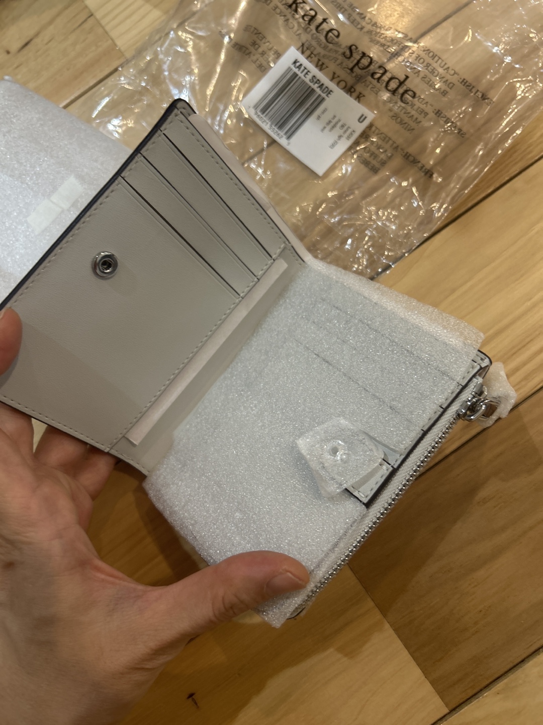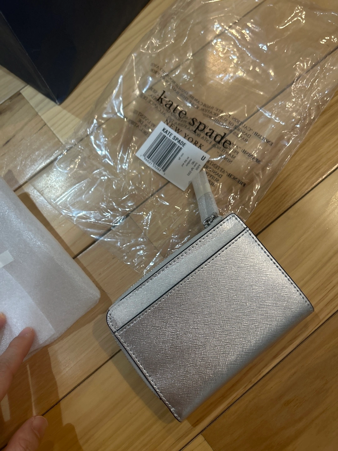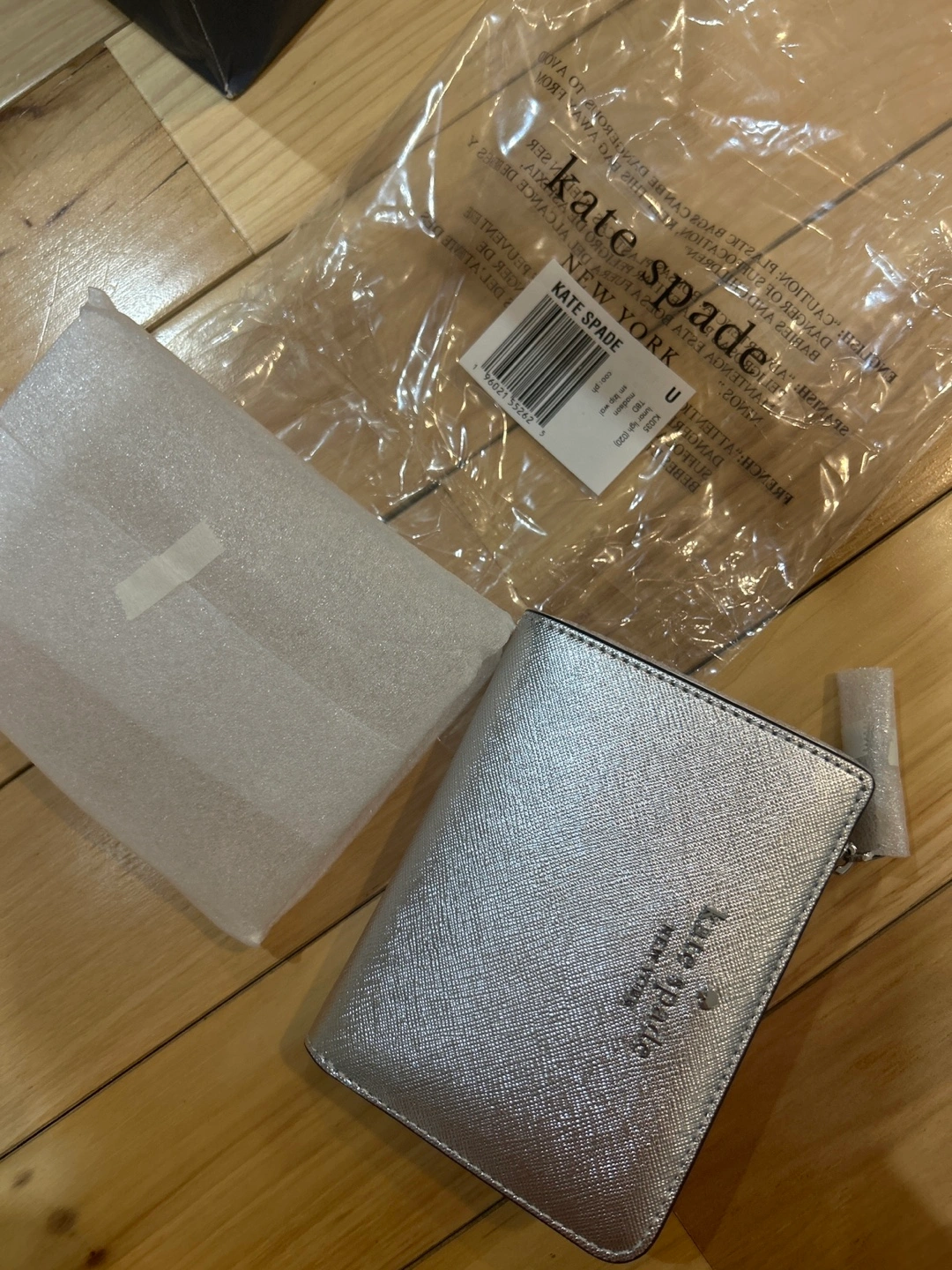 Small silver wallet. Zip closure. Multiple card slots and billfold. New with tags.