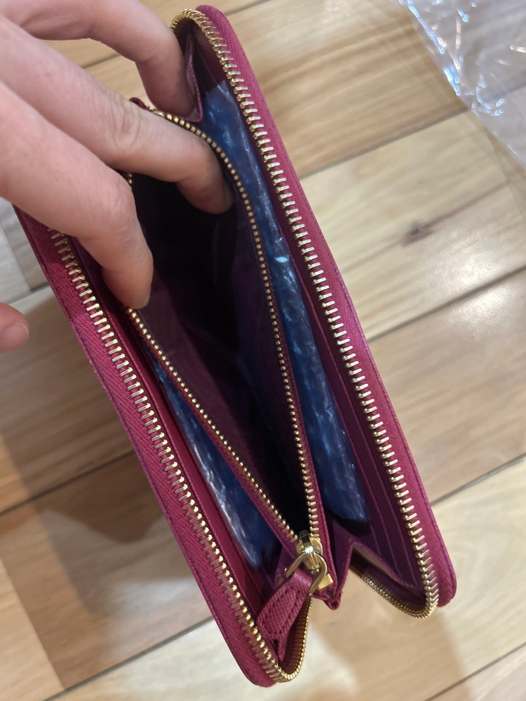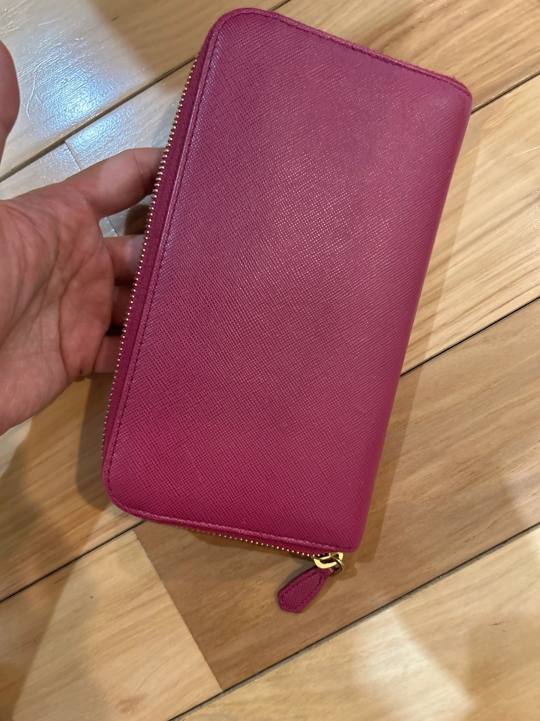 Beautiful pink Prada wallet. Zip around closure. Gold hardware. Interior compartments. Saffiano leather.