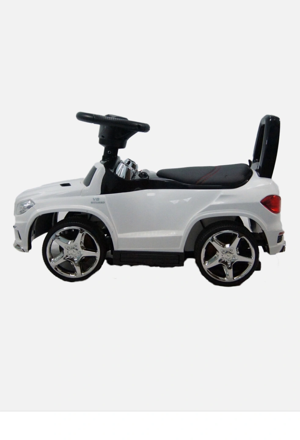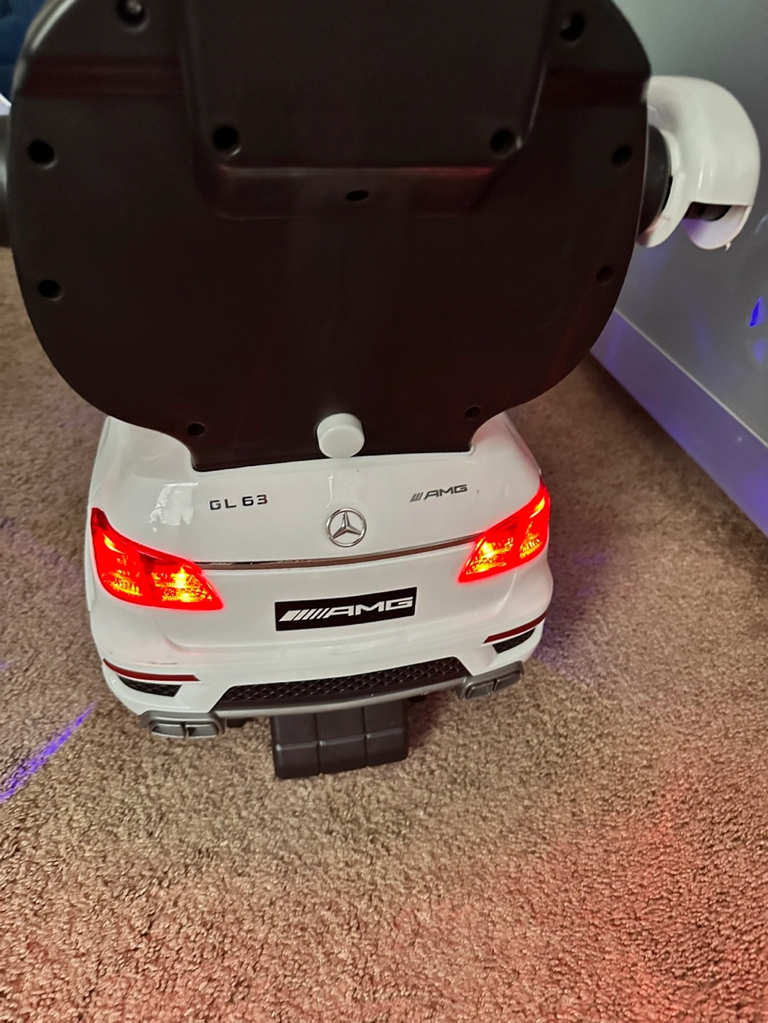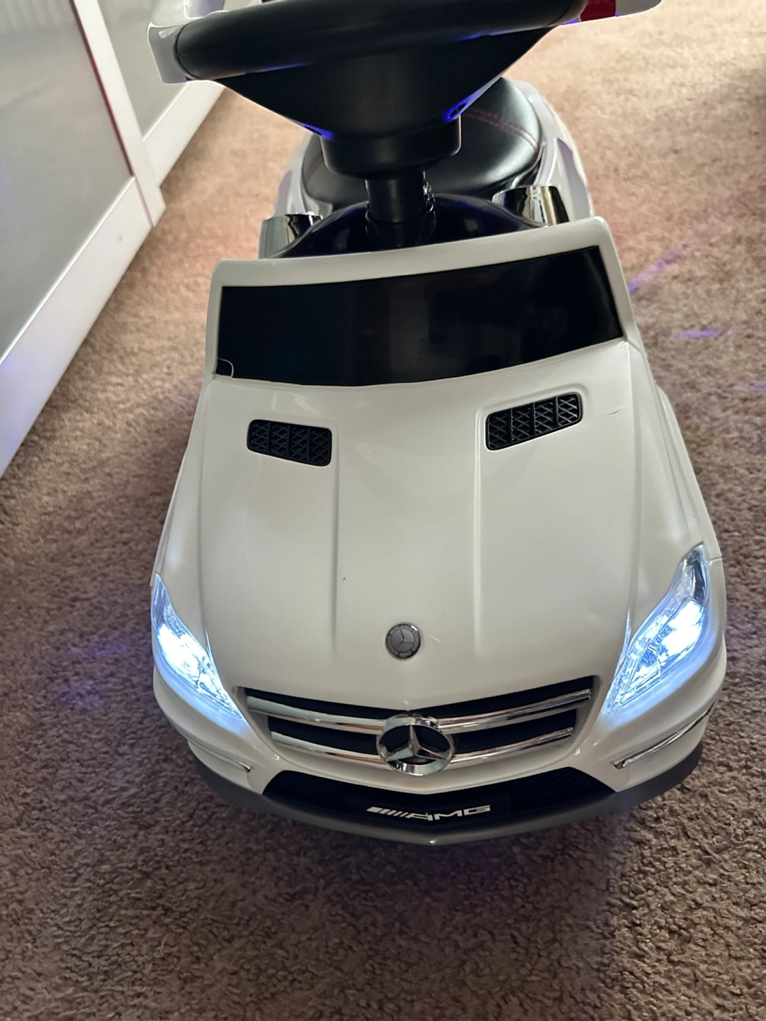 White children's ride-on car. Features lights, MP3 player and a comfortable seat. Looks like a Mercedes-Benz GL63 AMG. Battery operated. Great for baby’s and toddlers ages 1 to 3 to push around.