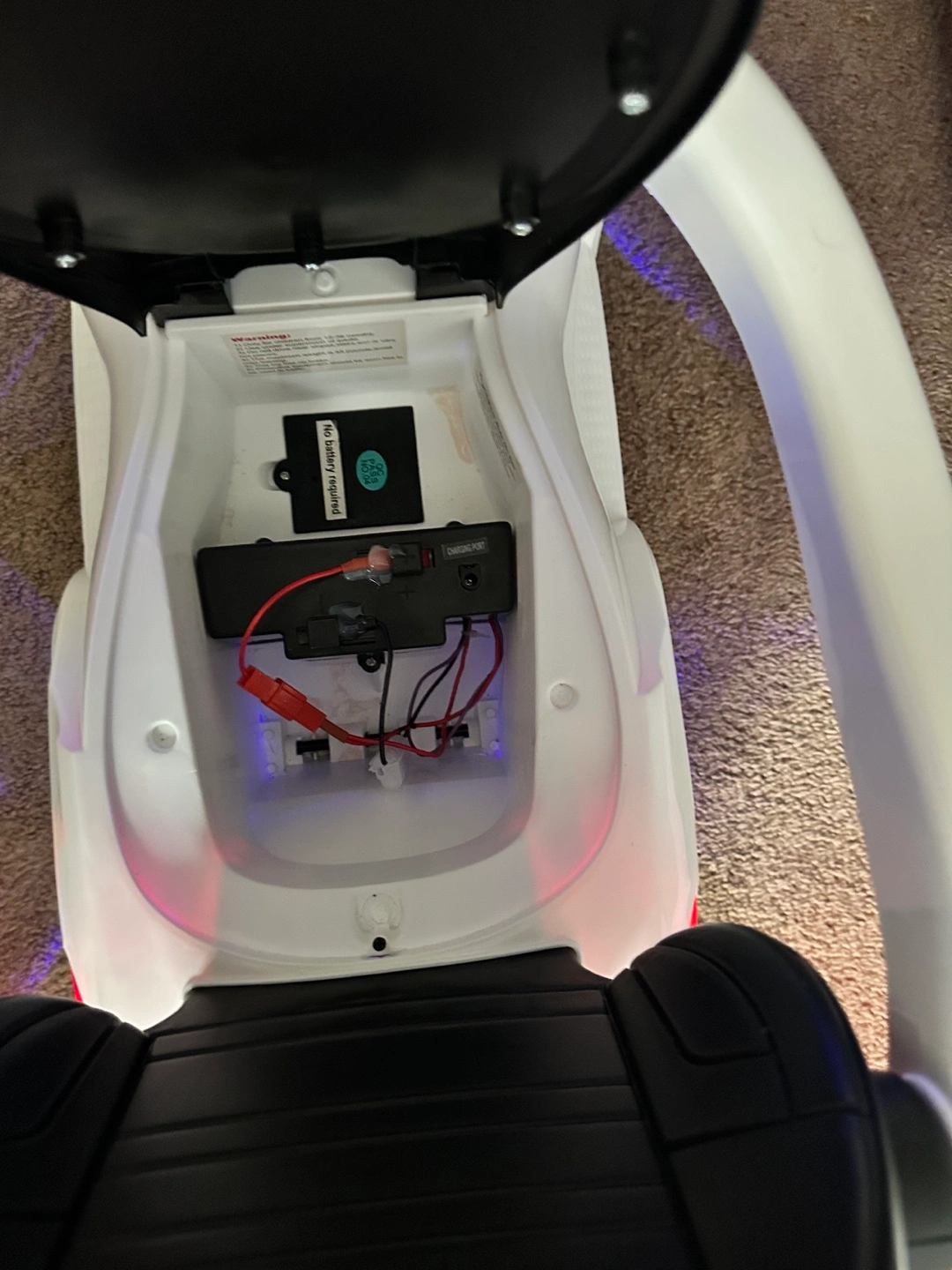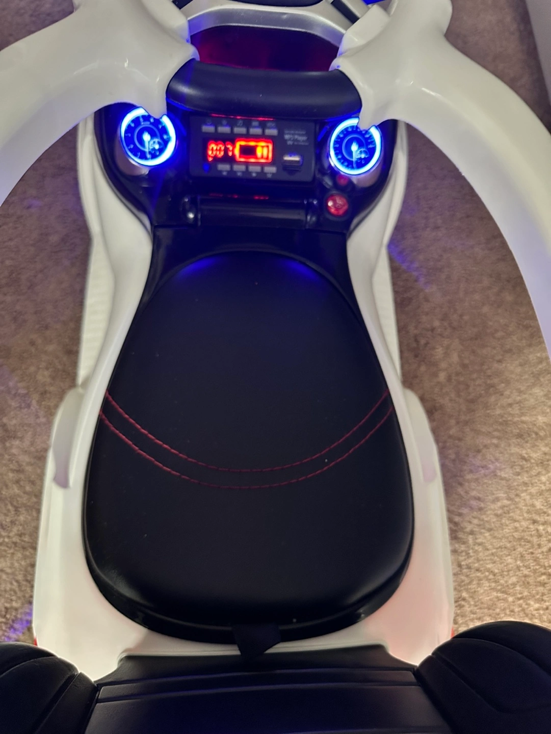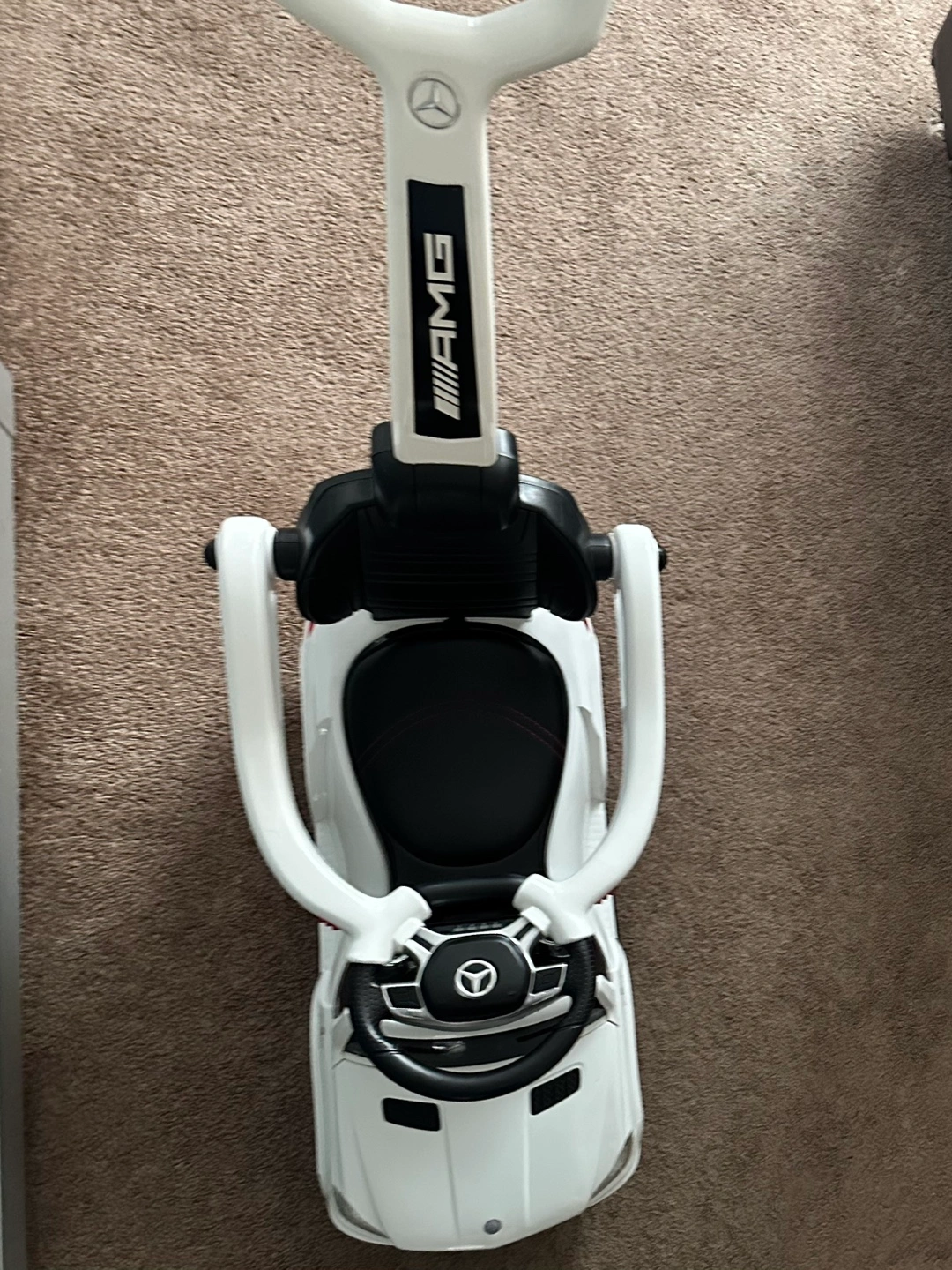 White children's ride-on car. Features lights, MP3 player and a comfortable seat. Looks like a Mercedes-Benz GL63 AMG. Battery operated. Great for baby’s and toddlers ages 1 to 3 to push around.