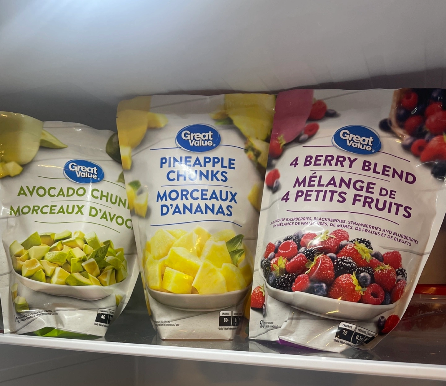 Three unopened bags of frozen fruit. Avocado chunks, pineapple chunks, and a four berry blend. Great Value brand.