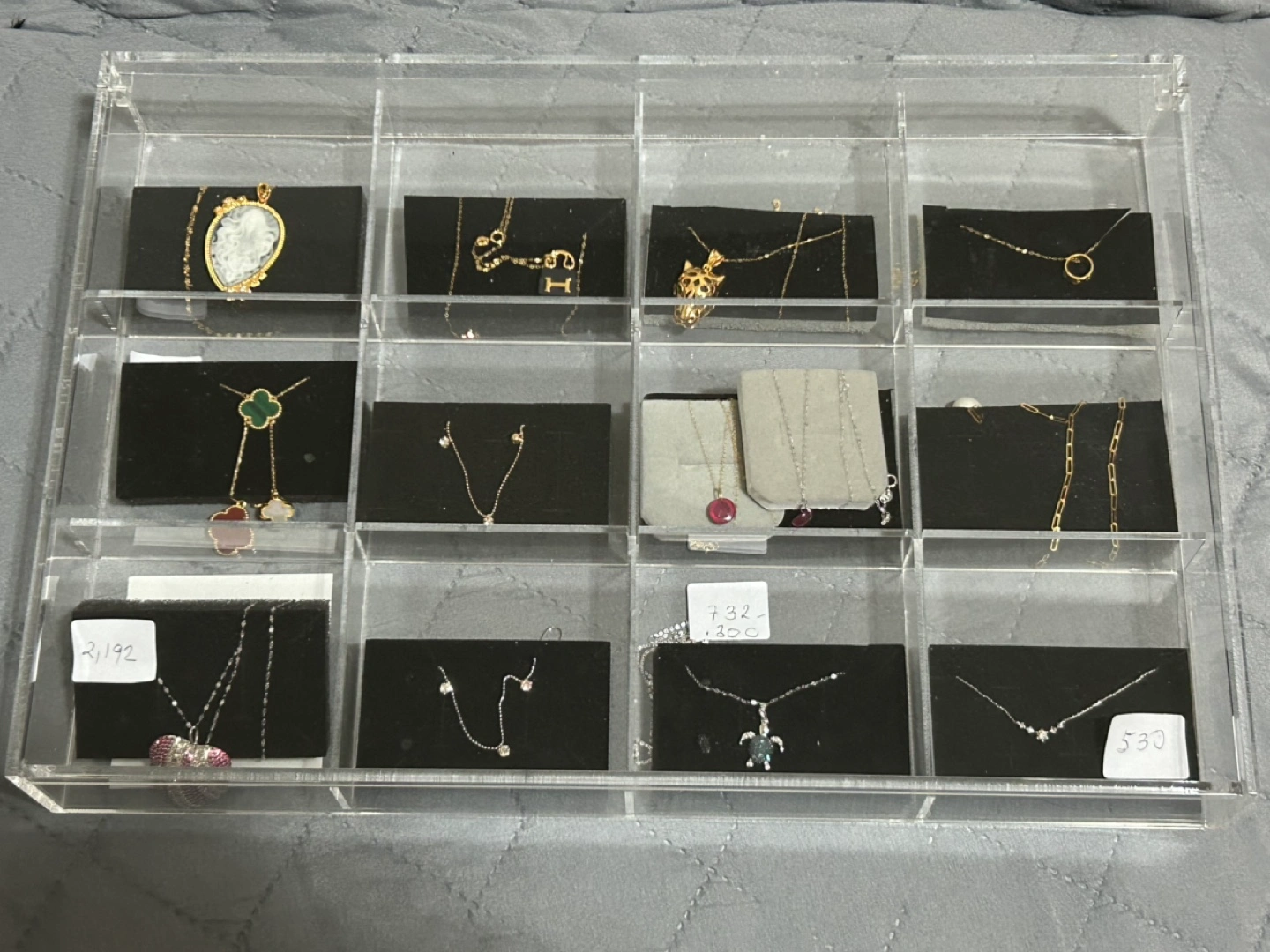 Various necklaces, different styles and materials. Gold and silver chains, pendants include hearts, clover, animals, and more. Organized in clear acrylic display case. Each item has a different price and is authentic. DM for more information~