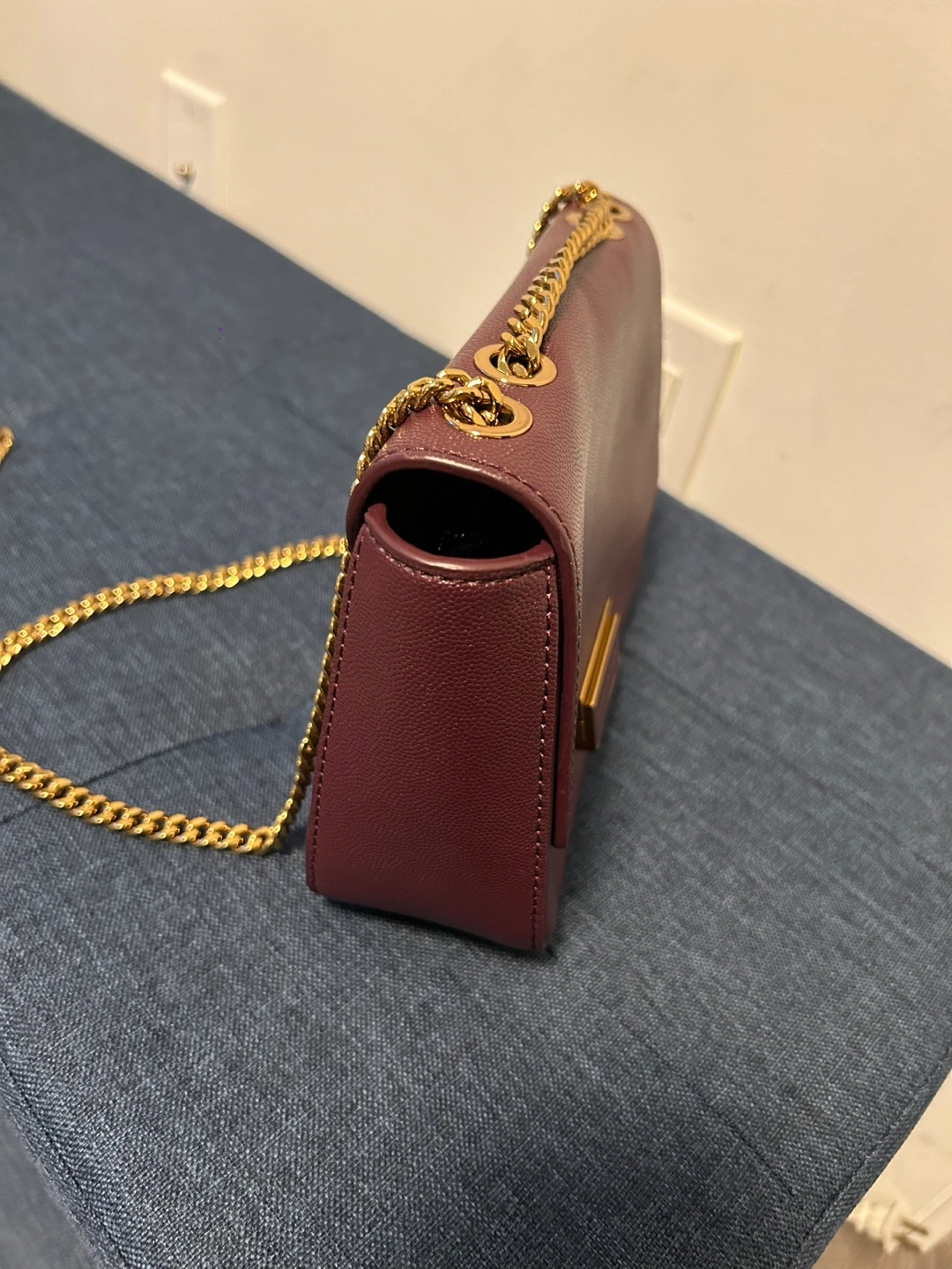 Burgundy crossbody bag. Gold chain strap. Flap closure. Small interior compartment. Very good condition.