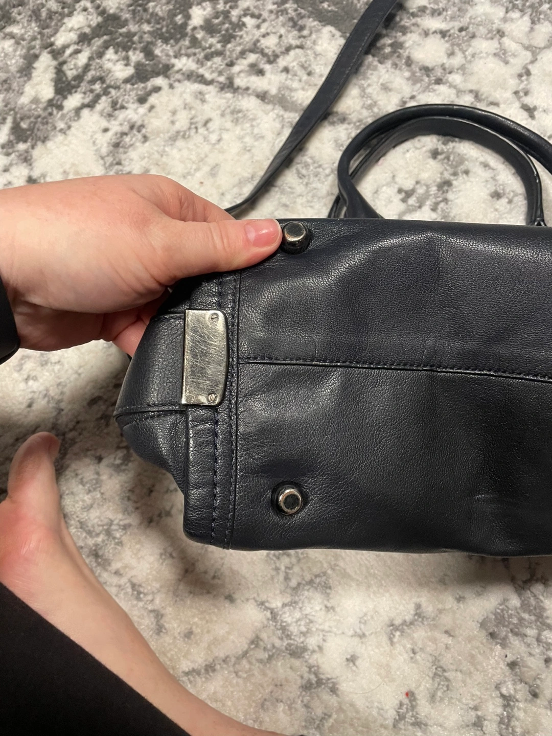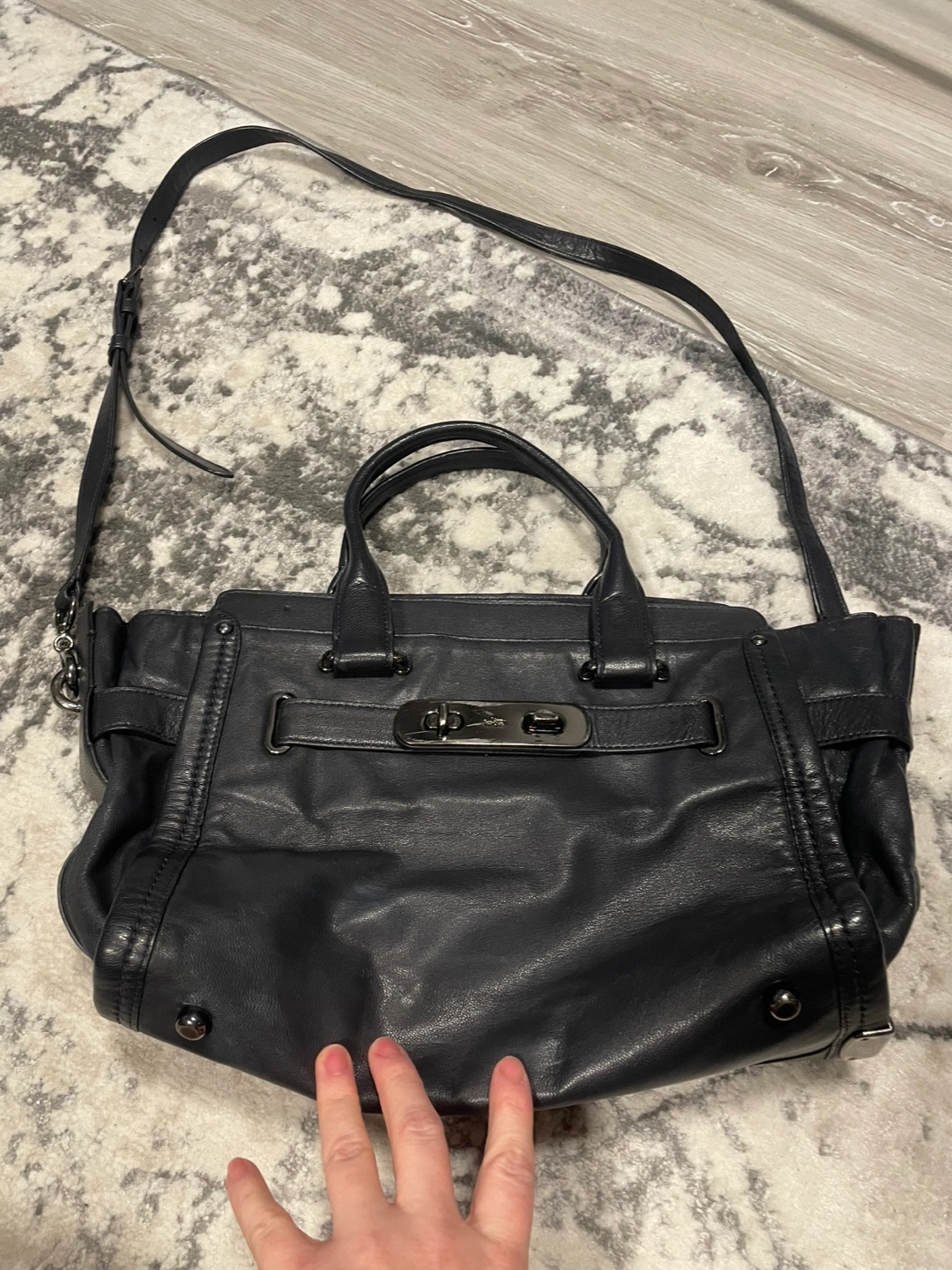 97Black leather satchel. Features two top handles and a detachable shoulder strap. Zip closure. Silver-toned hardware. Interior lining.
