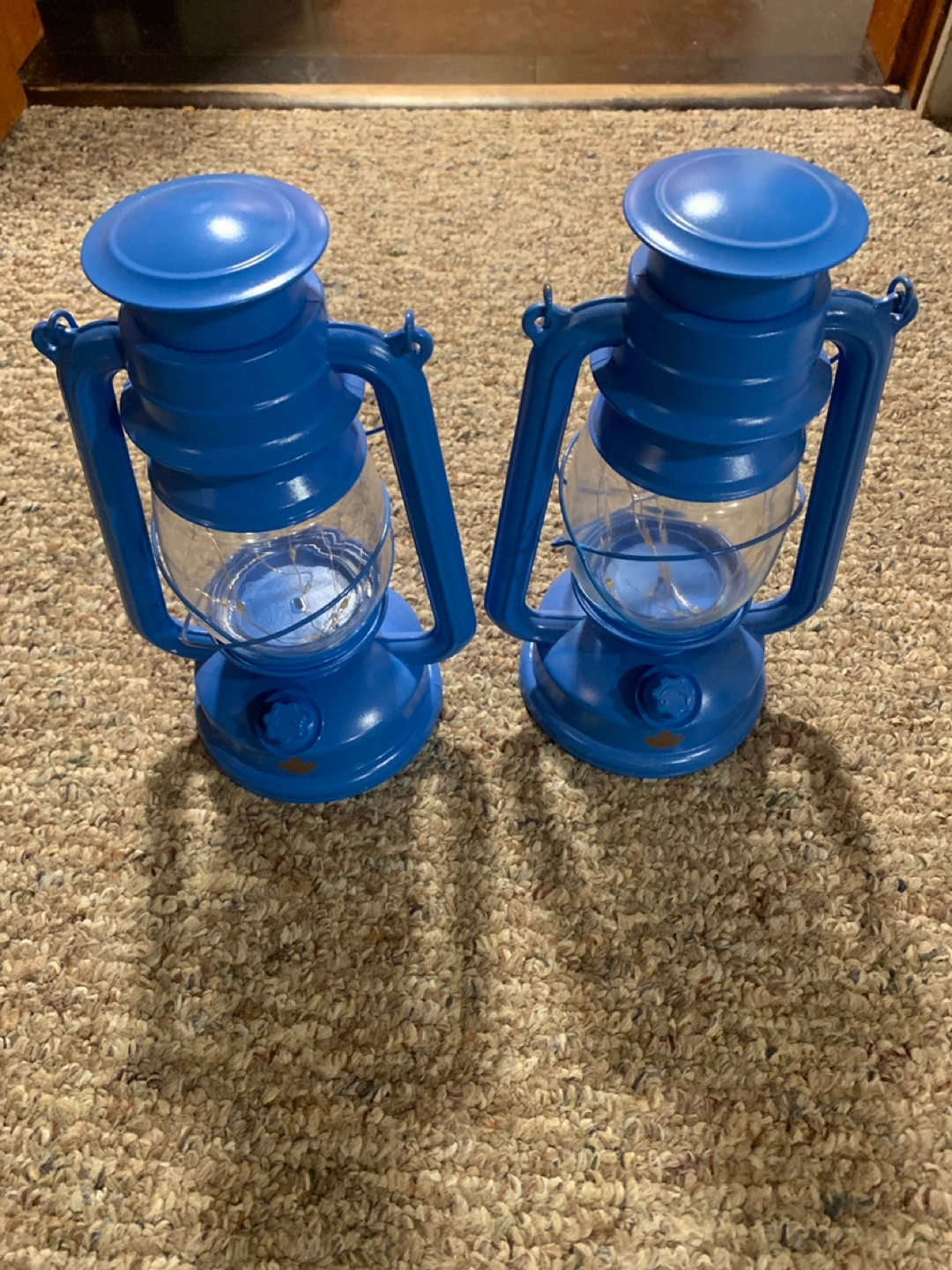 Two blue LED lanterns. Perfect for decor or camping. Battery operated. Glass panels.