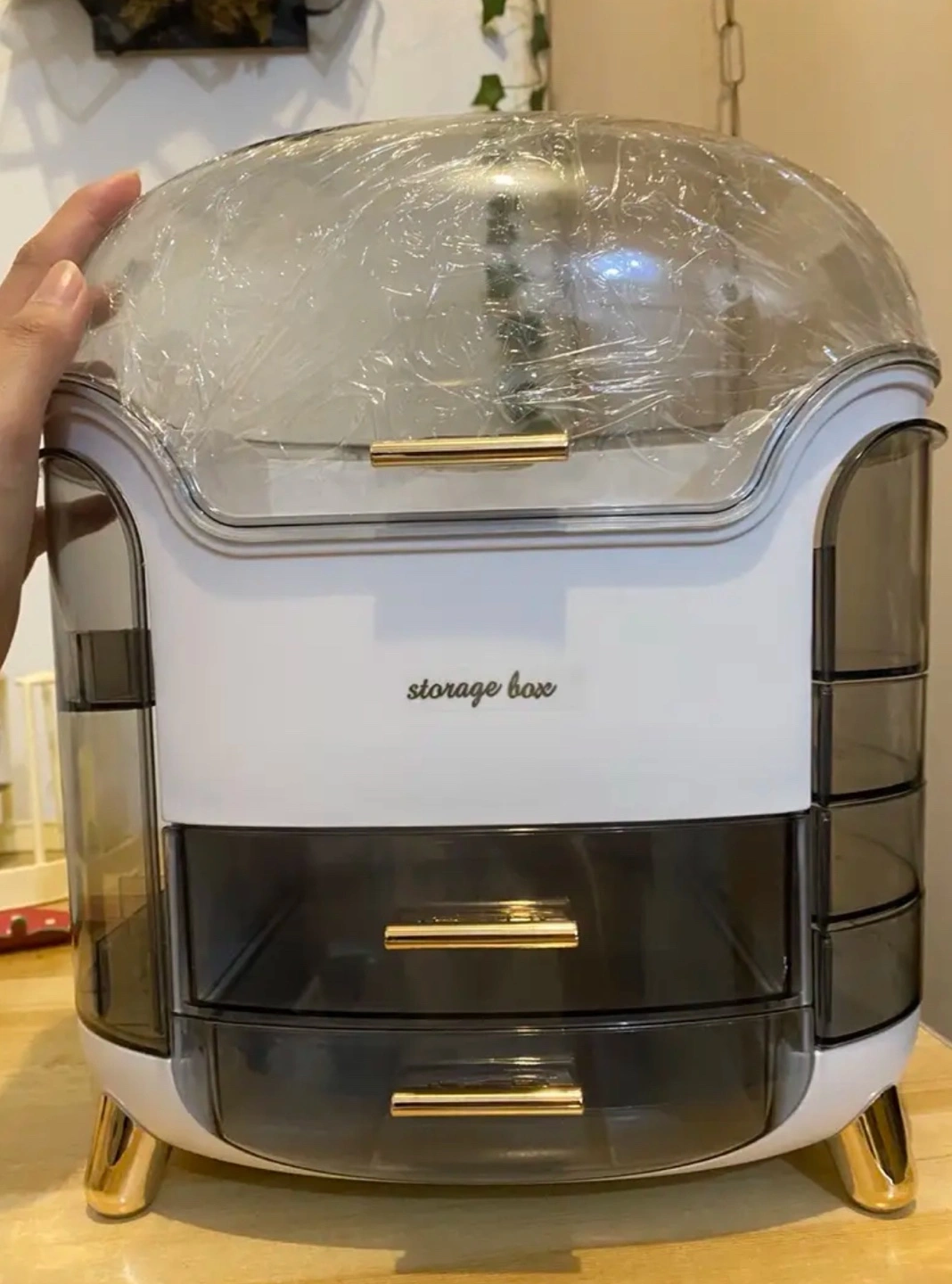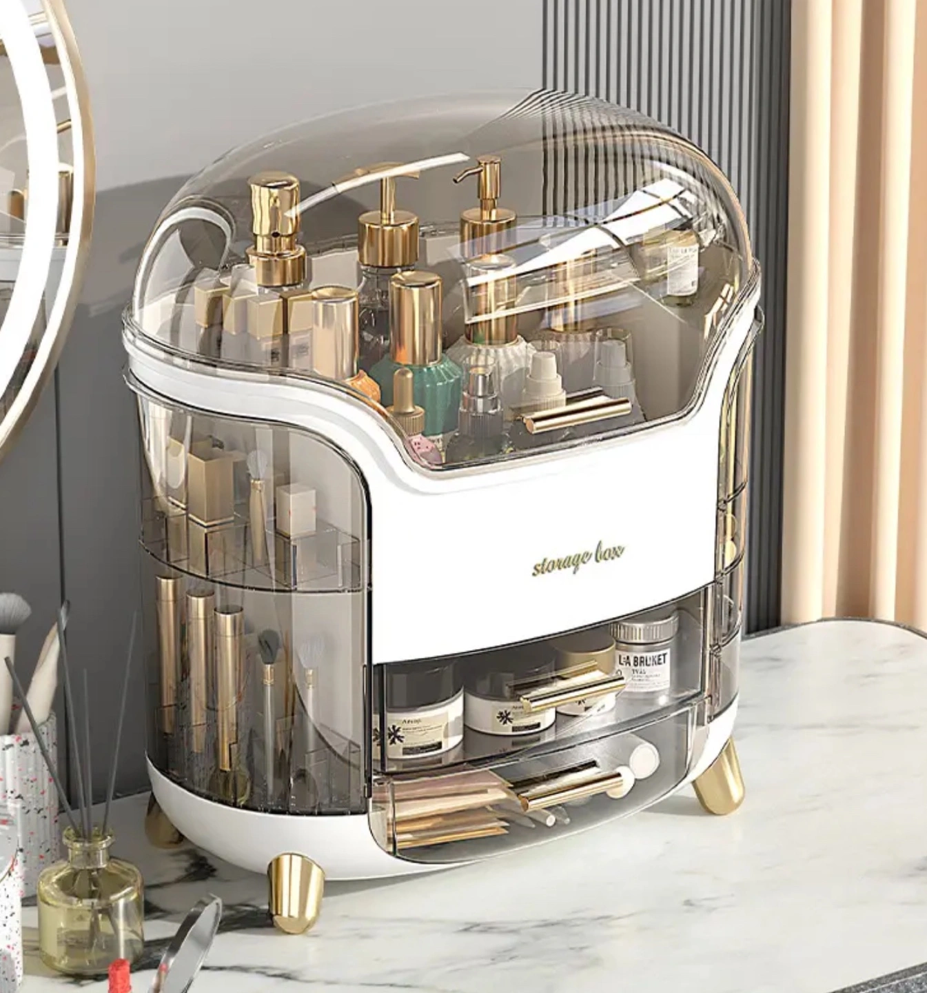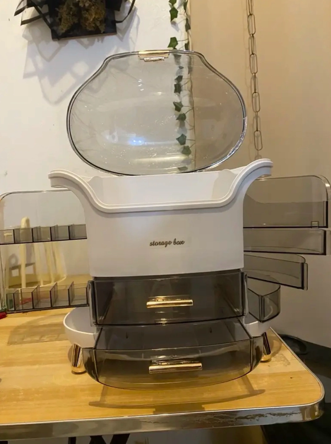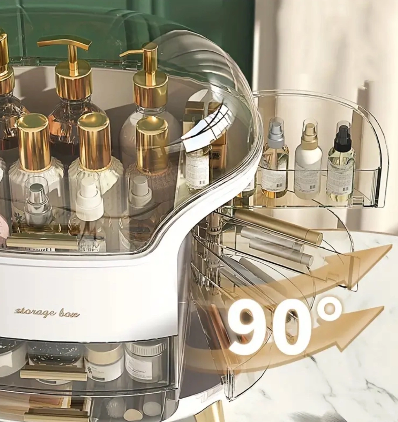 Large capacity rotating cosmetic organiser. Multiple drawers and compartments. Clear, see-through design. Gold accents. Perfect for makeup, skincare, and toiletries.