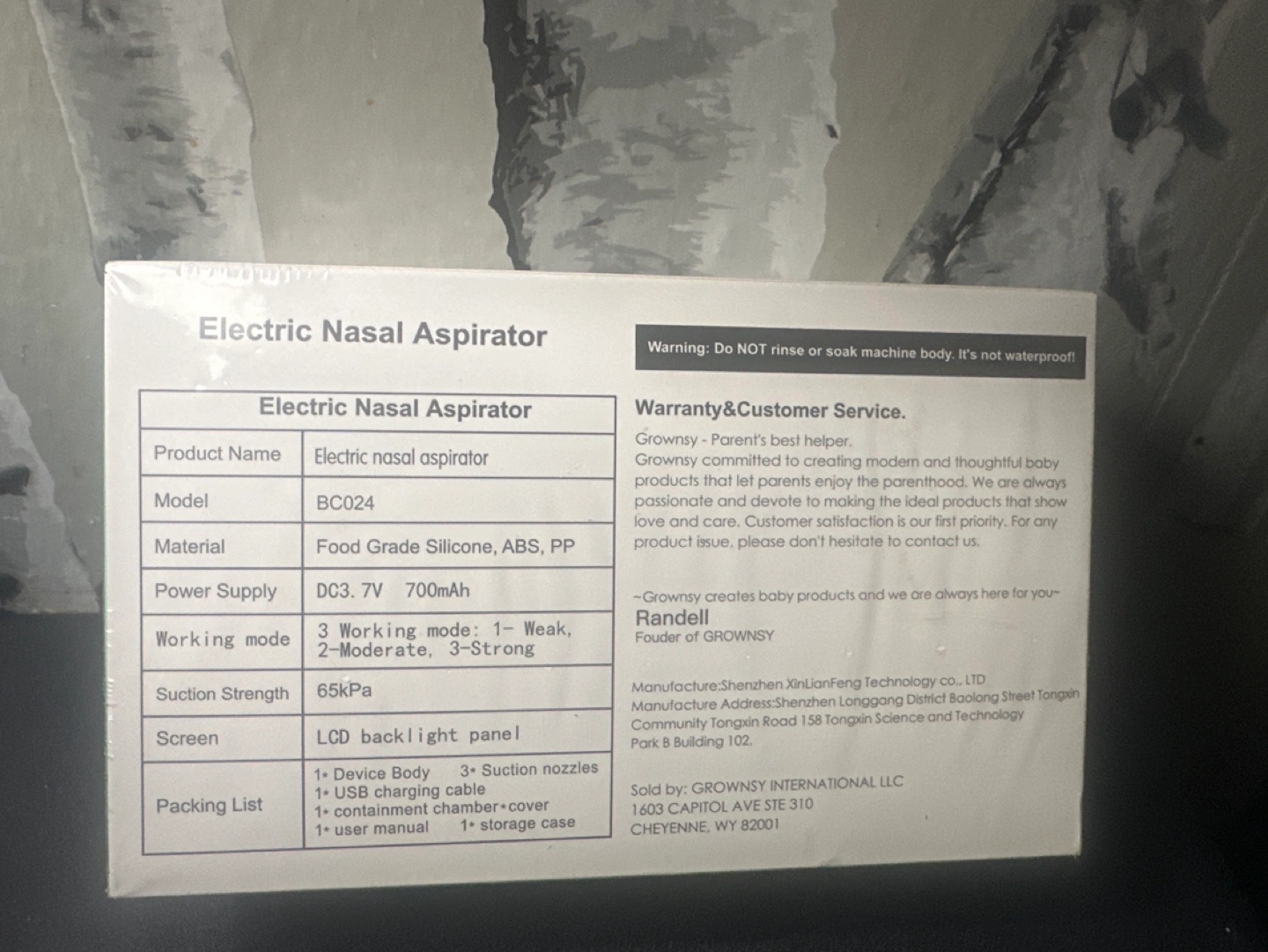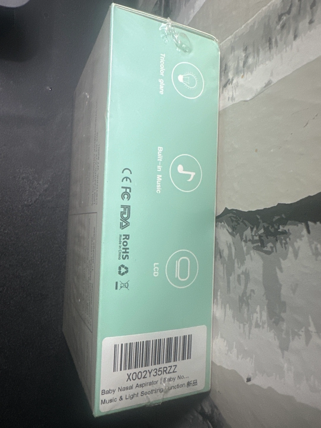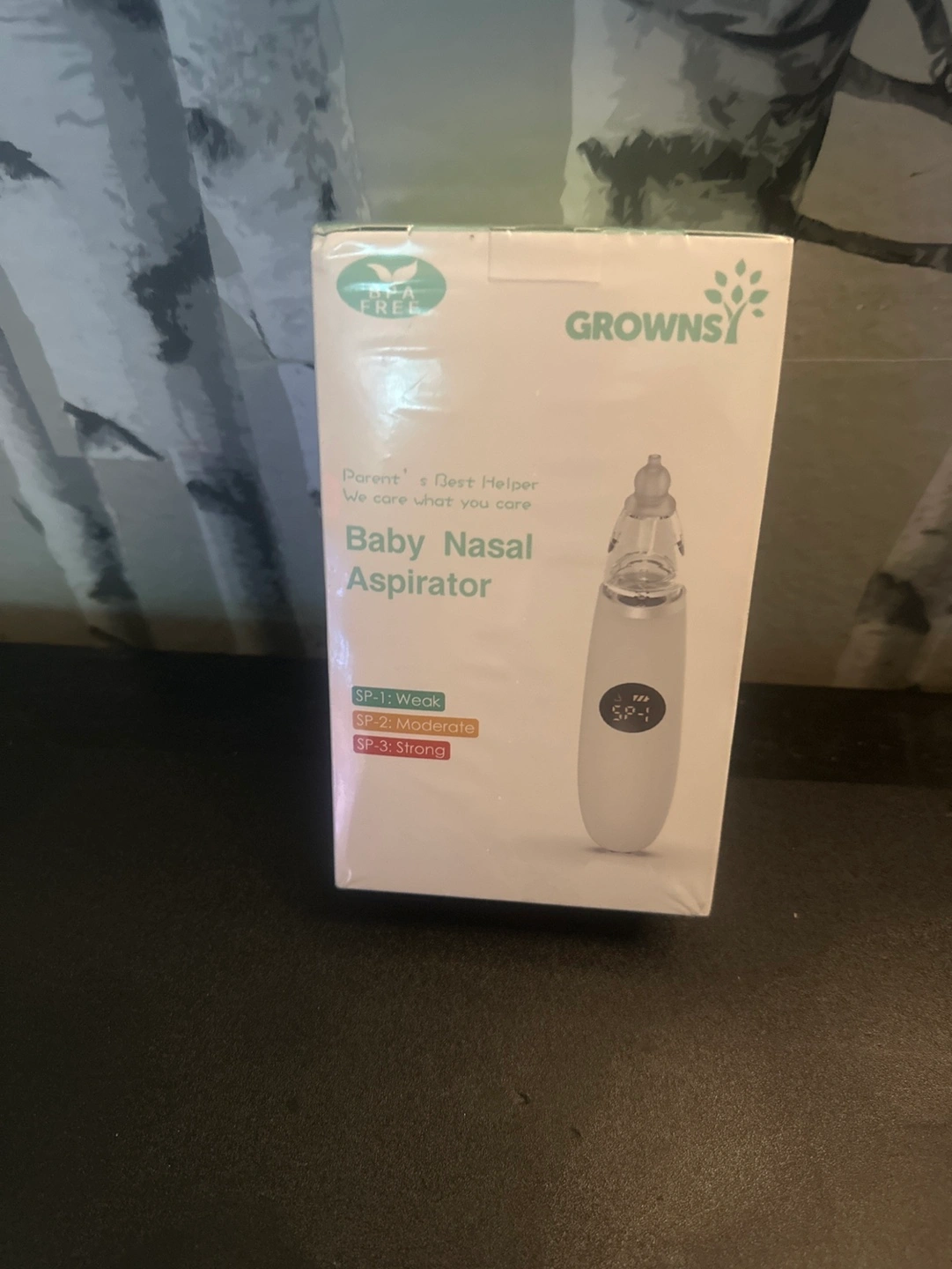 New, in box. Electric baby nasal aspirator. Three suction settings: weak, moderate, strong. Includes LCD backlight, built-in music, and three suction nozzles. Model BC024.