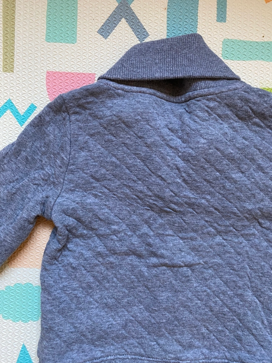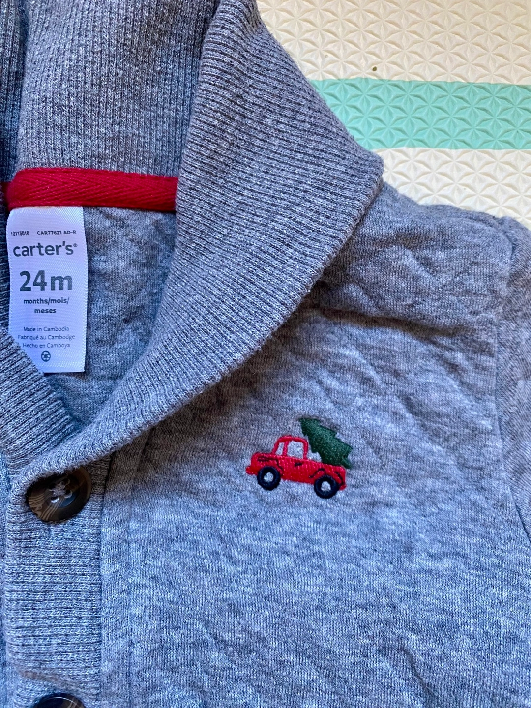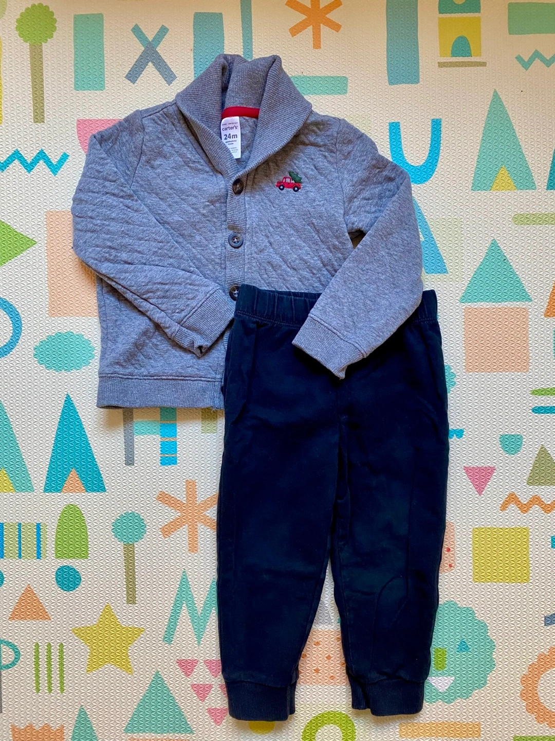 Adorable Carter's outfit. Includes a grey quilted cardigan with a festive truck embroidery and black pant. Size 24 months. Great for the holidays or festive parties.