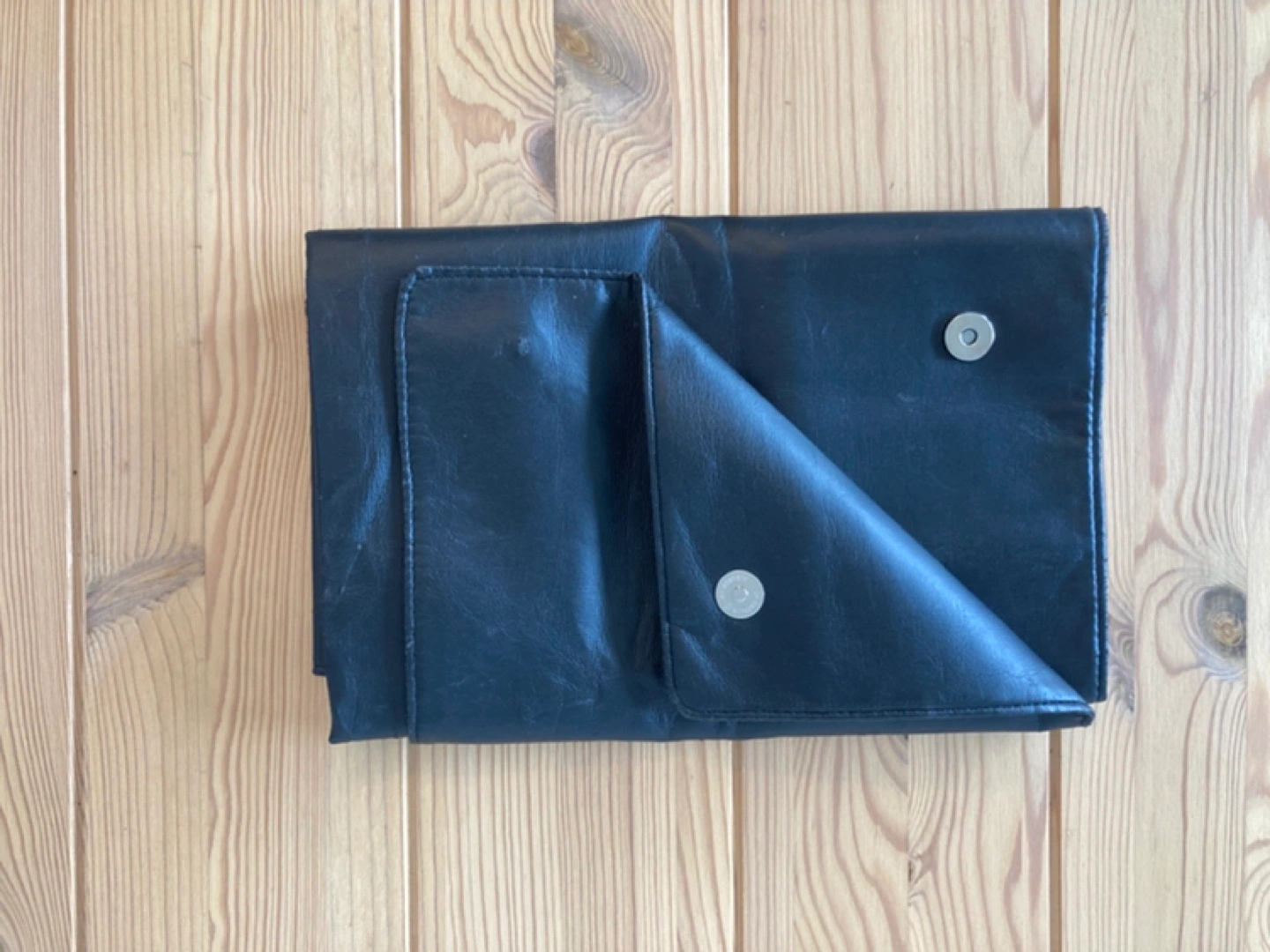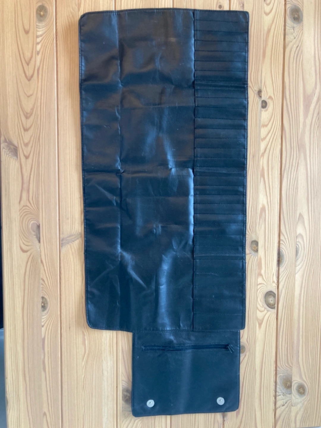 945Black faux leather makeup brush roll. Multiple slots for brushes. Small zippered pouch. Great for travel or storage.