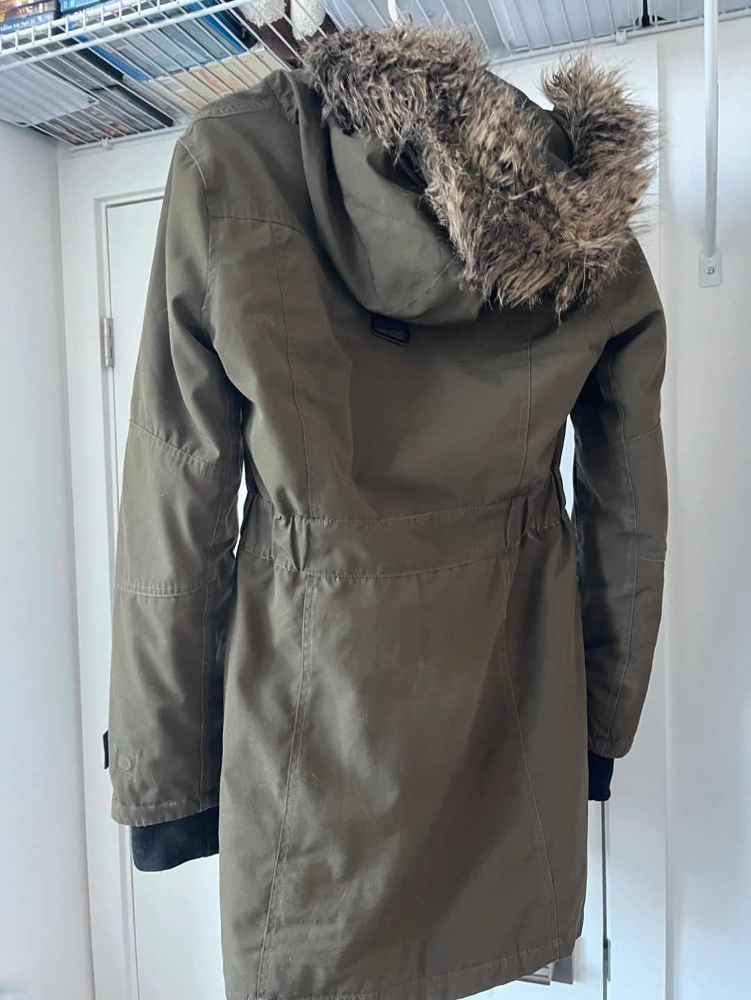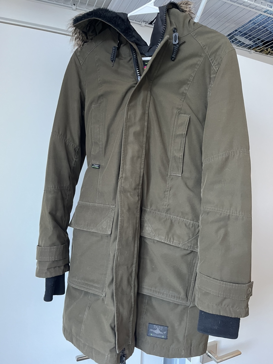 Olive green parka. Size small but slim fit so it fits more like a XS. Faux fur-trimmed hood, multiple pockets with magnetic closures. Very warm!