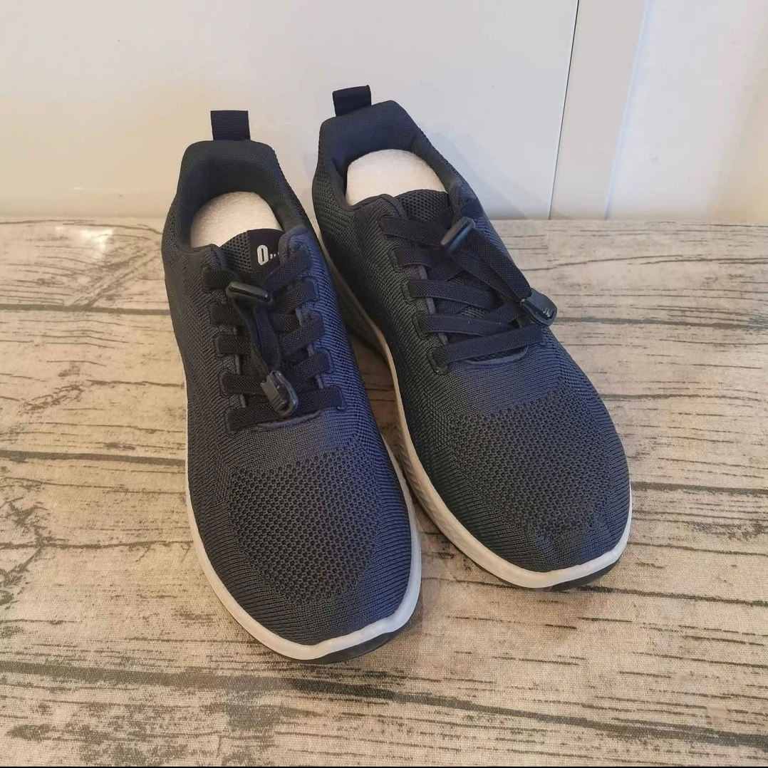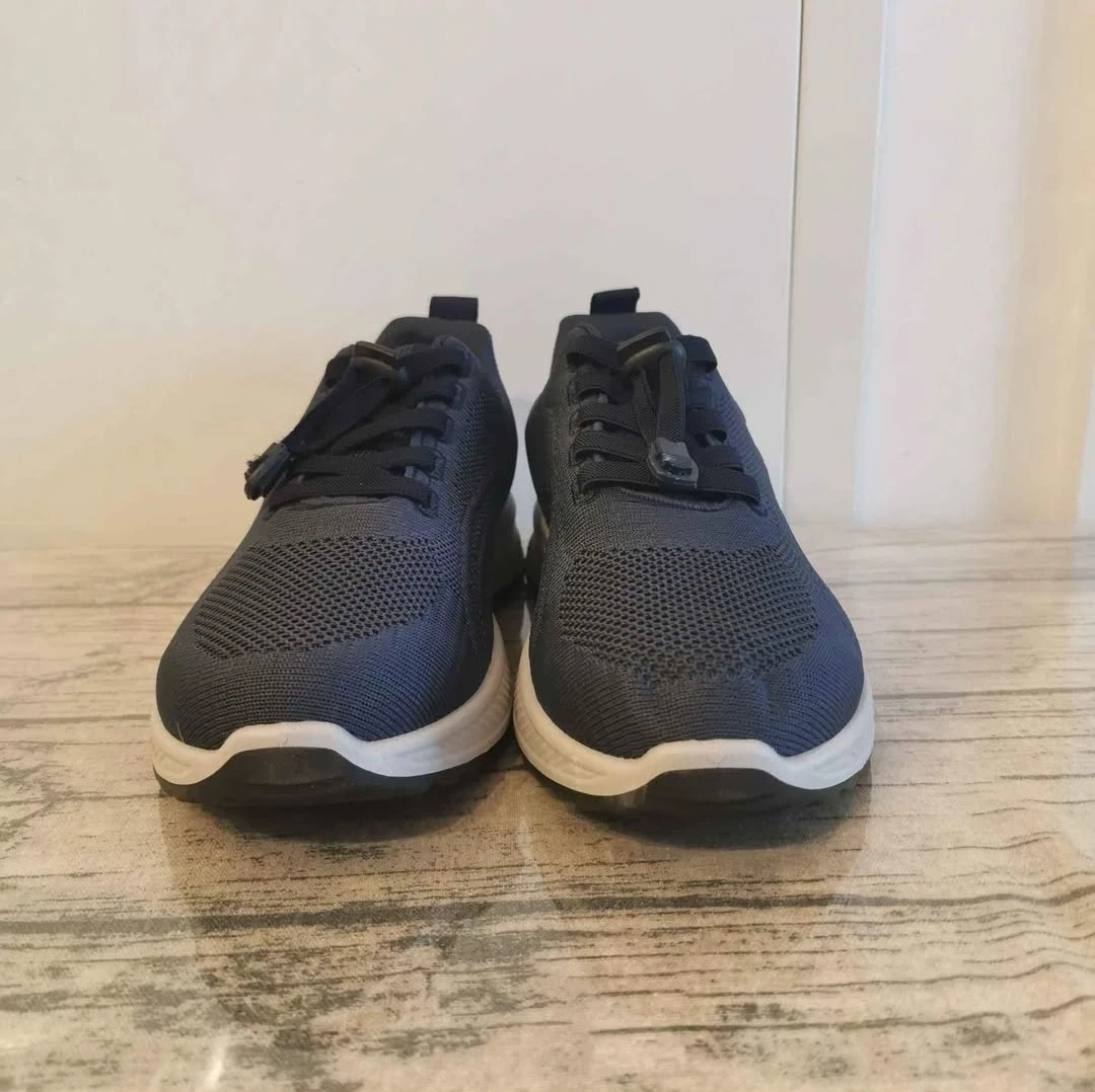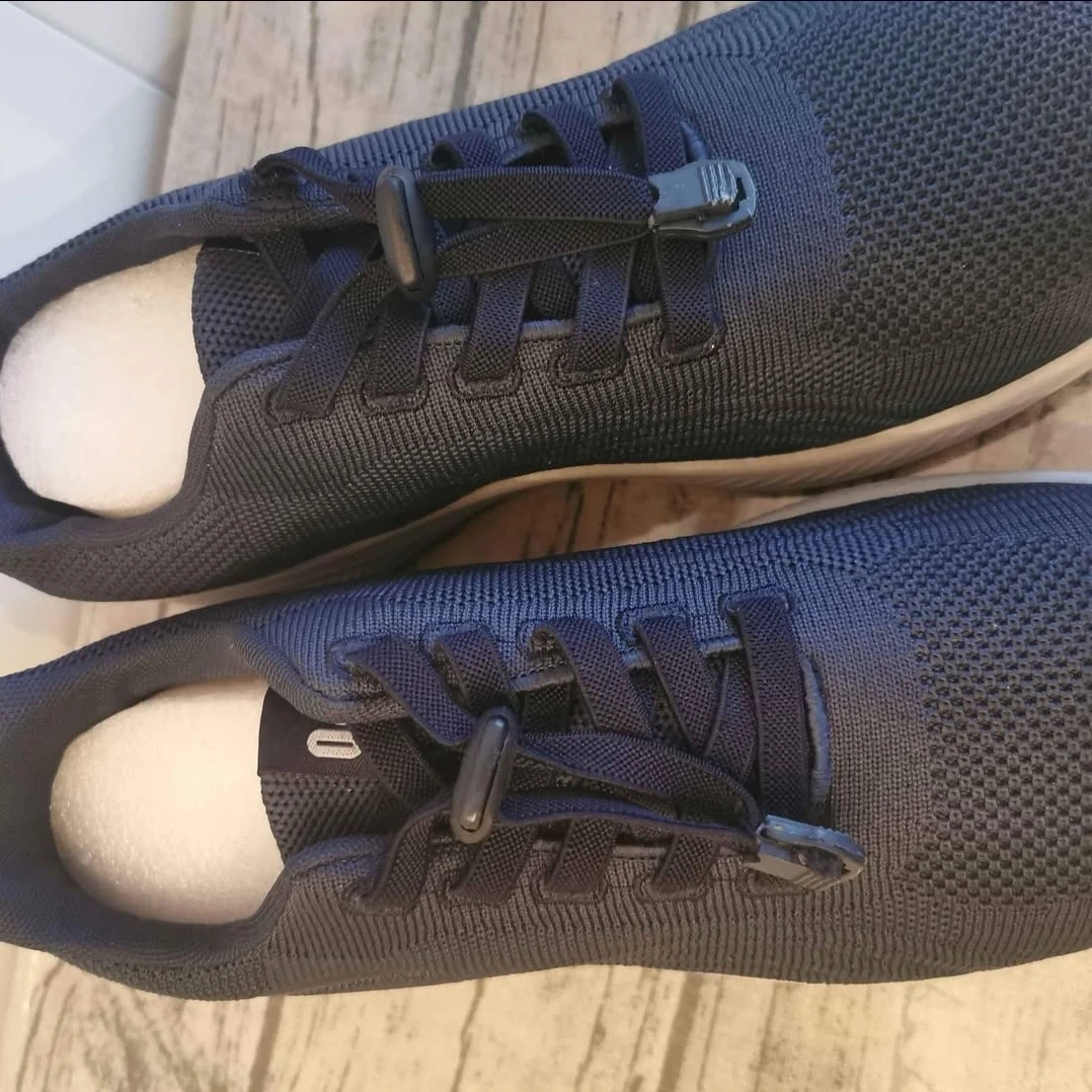 Pair of navy blue men's running shoes. Brand New. Knit upper, white sole. Lace-up closure with quick-release fasteners. Lightly cushioned insole. Comfortable and stylish.