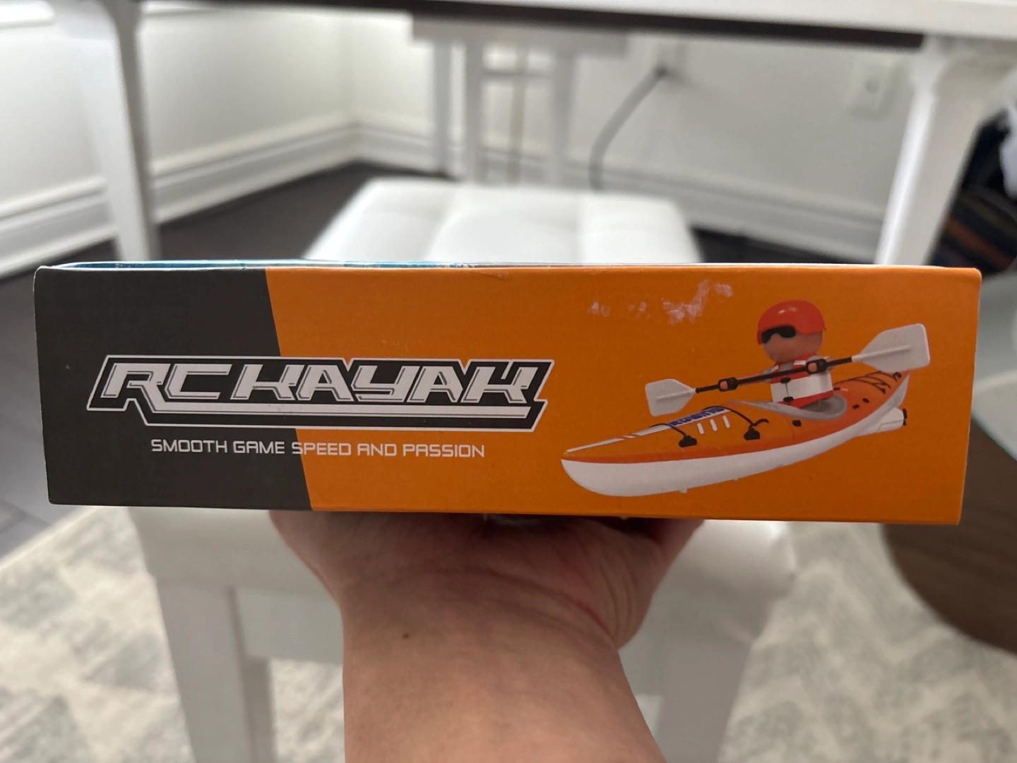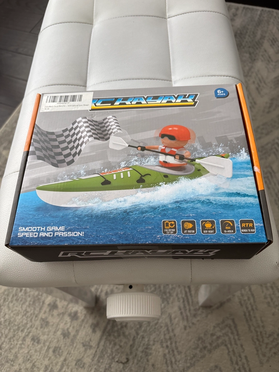 Remote control kayak toy. New in box. Ages 6+. Includes remote and boat. Smooth game speed and passion!