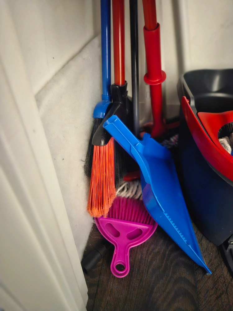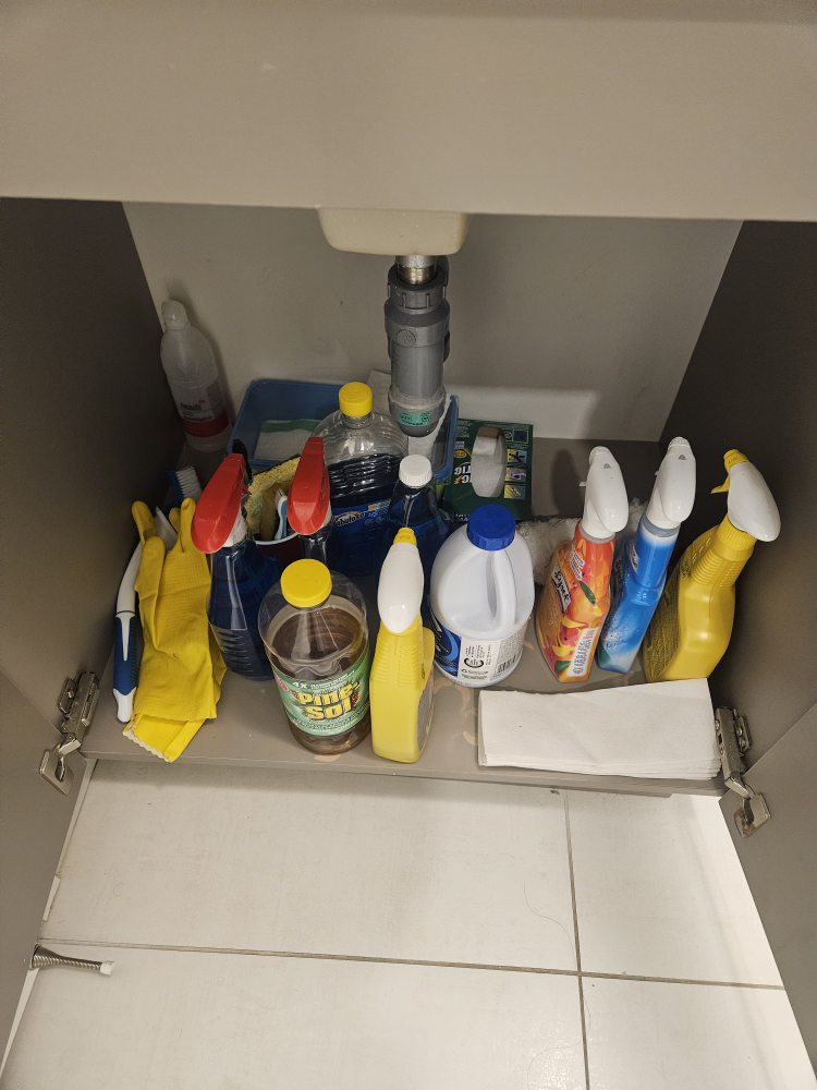 Large bundle of cleaning supplies. Various cleaners, spray bottles, brushes, dustpan and broom set. Yellow rubber gloves. Great for home or office cleaning.