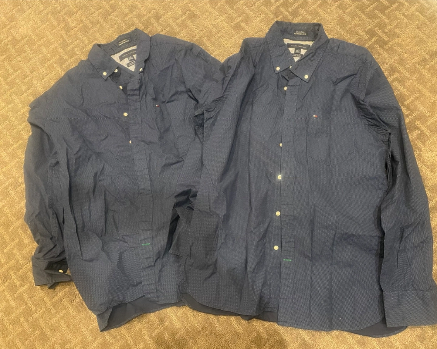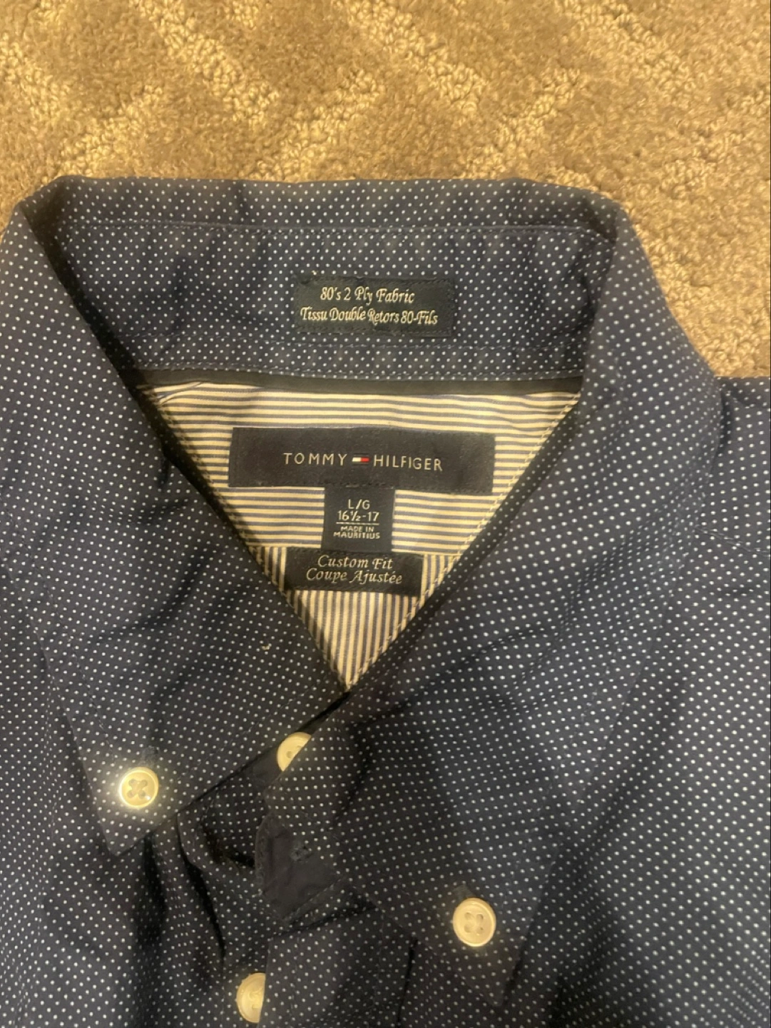282 Tommy Hilfiger navy blue long sleeve button-down shirts. Custom fit. Large 16 1/2-17 white polka dots.