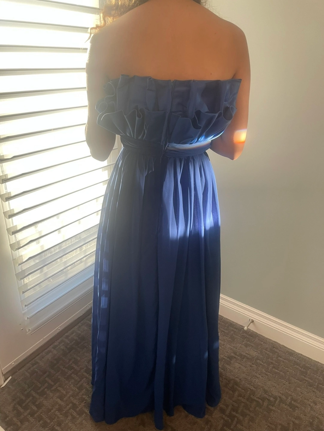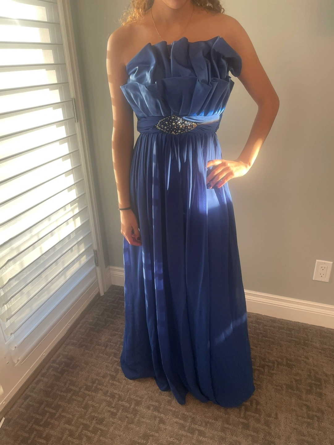 28Gorgeous royal blue floor-length gown. Strapless bodice with ruched detail. Features a jeweled embellishment at the waist. Perfect for prom, a special occasion, or a formal event. Elegant and flattering silhouette. Size small (2-4). Used once