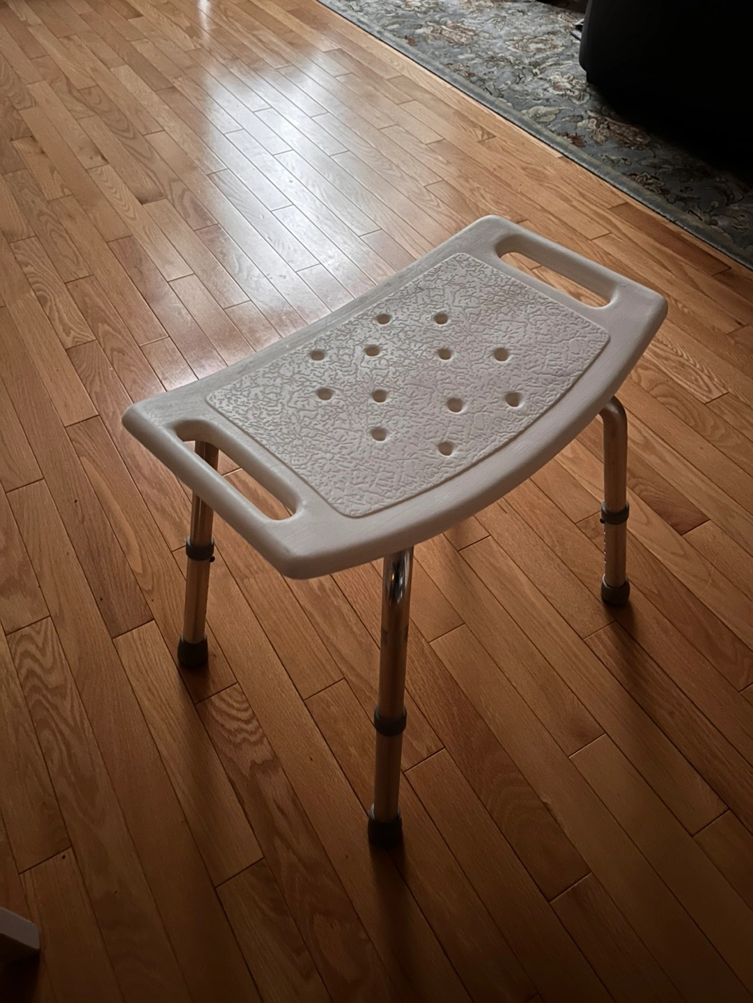 White plastic shower chair. Adjustable height legs. Non-slip surface. Great for seniors or people with mobility issues.