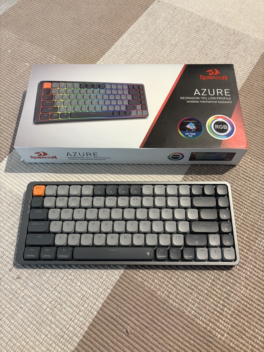 Compact mechanical keyboard. Grey and black colour scheme. Low profile design. Includes original box, extra full set of grey keycaps and keycap puller in the box. RGB per-key lighting.