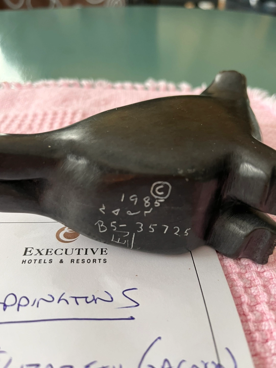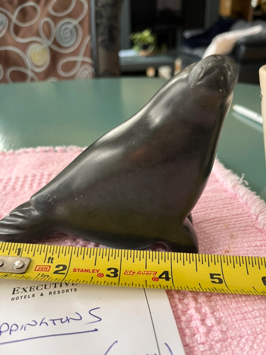 Hand-carved soapstone seal. Dark grey colour. Measures approximately 4 inches long. Artist signature and date visible. Unique collectible.