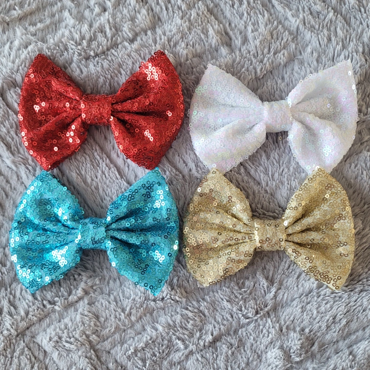 Set of four sparkly sequin hair bows. Colours include: red, white, light blue, and gold. Attached to alligator clips. Great for little girls, dress up, parties, and gifts.