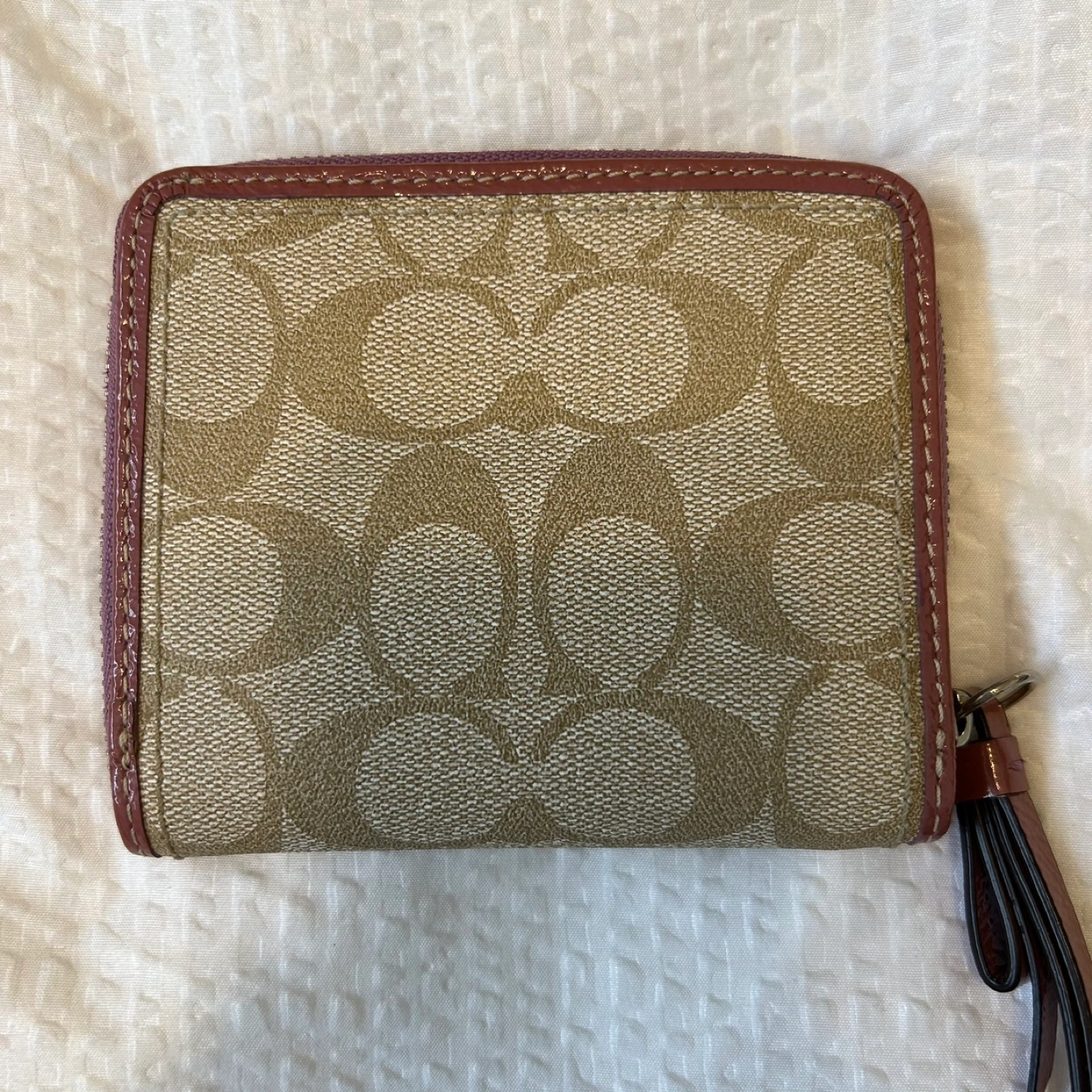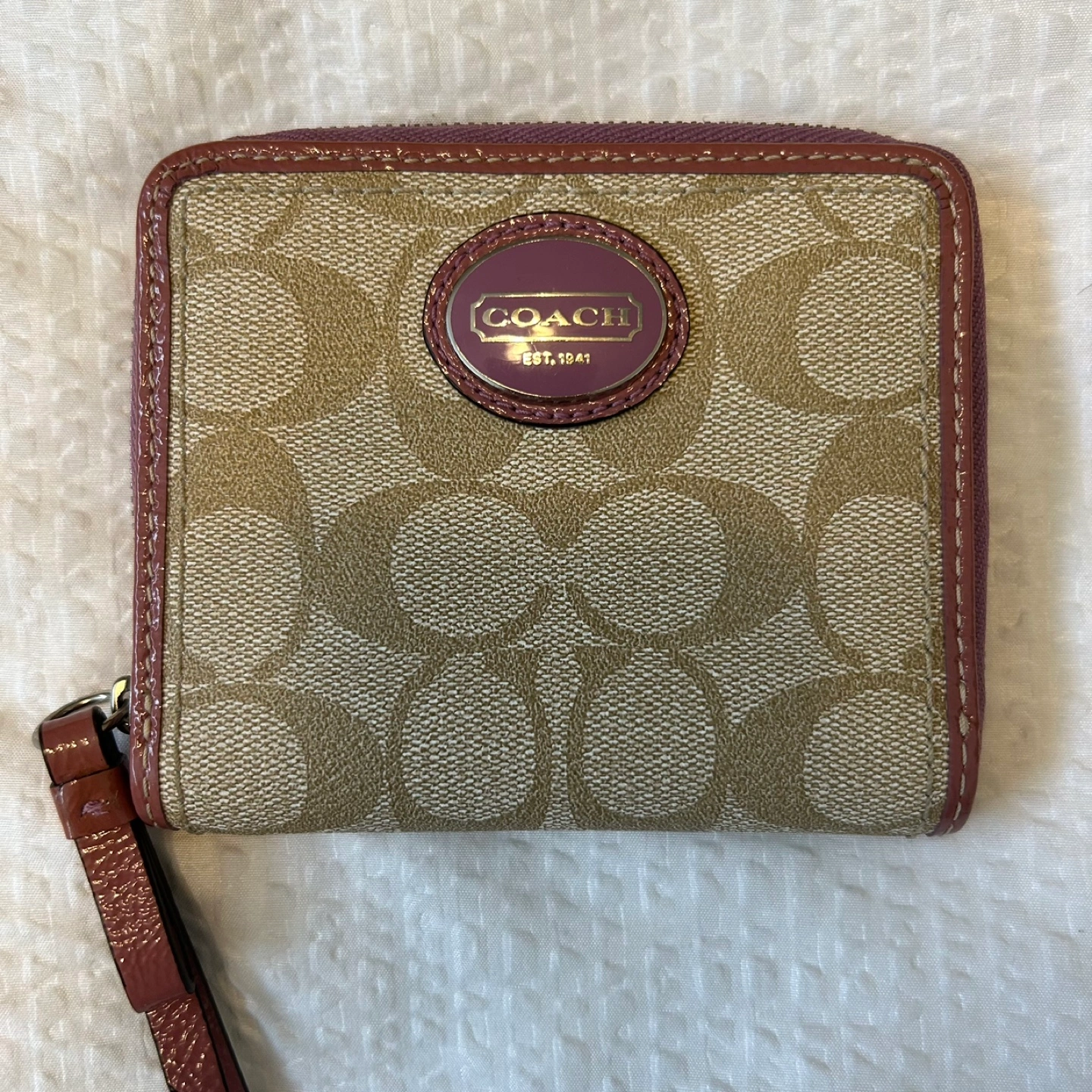 Beige and Pink Coach signature canvas wallet. Features a burgundy leather zipper and wristlet strap. Multiple card slots and a zippered coin pouch inside. Gently used.