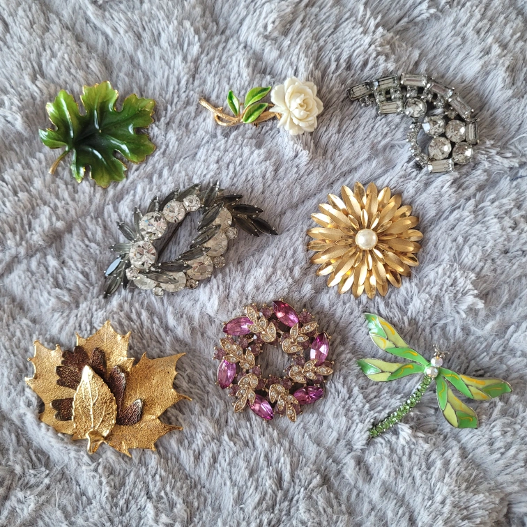 Assorted vintage brooches. Various colours and styles. Includes floral, leaf, dragonfly, and geometric designs. Rhinestones and enamel detailing. Great for collectors or fashion enthusiasts.