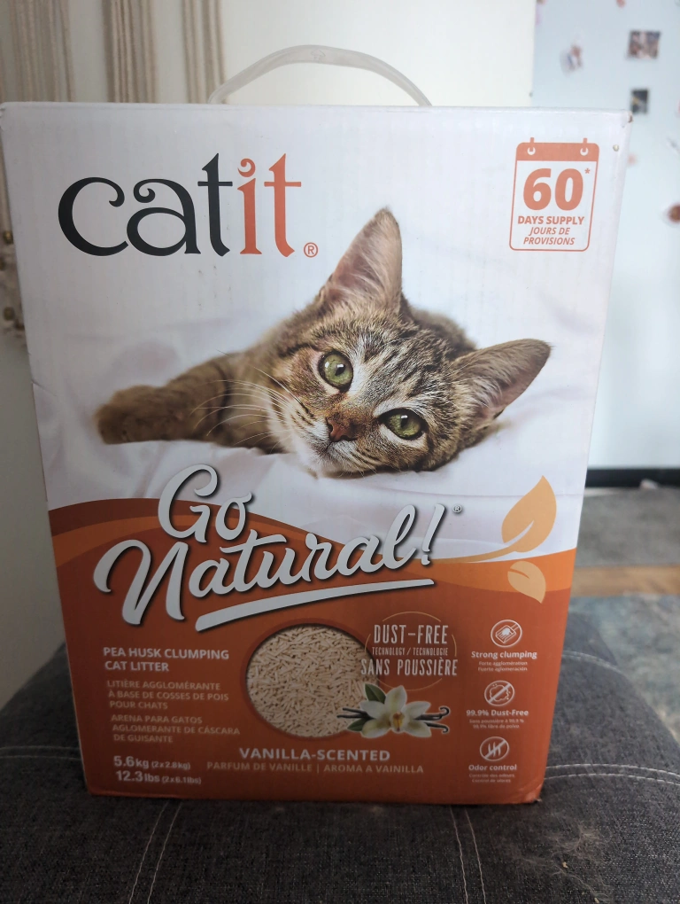 Partially used, over half the box left. very lightly vanilla-scented, dust-free, pea husk clumping cat litter. Strong clumping and odour control, excellent litter. my cat just isntta fan