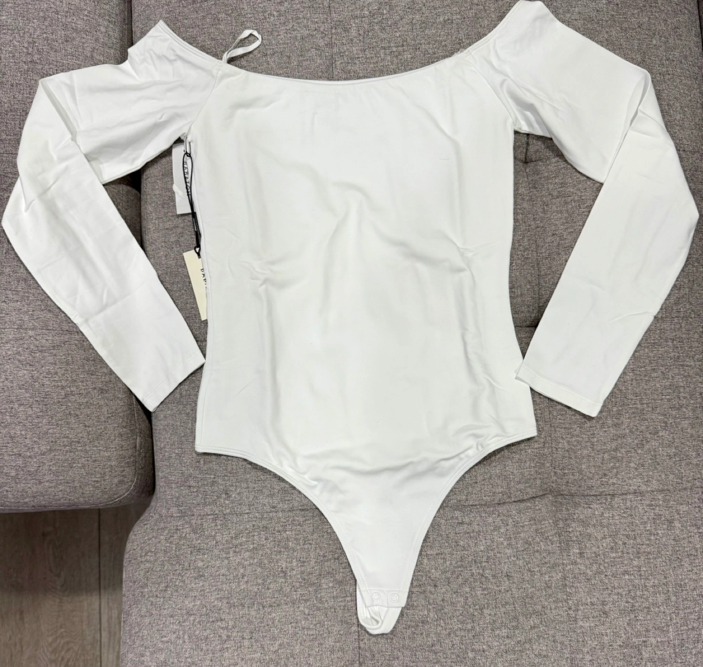 White long-sleeve bodysuit. Off-the-shoulder neckline. Size M. New with tags.