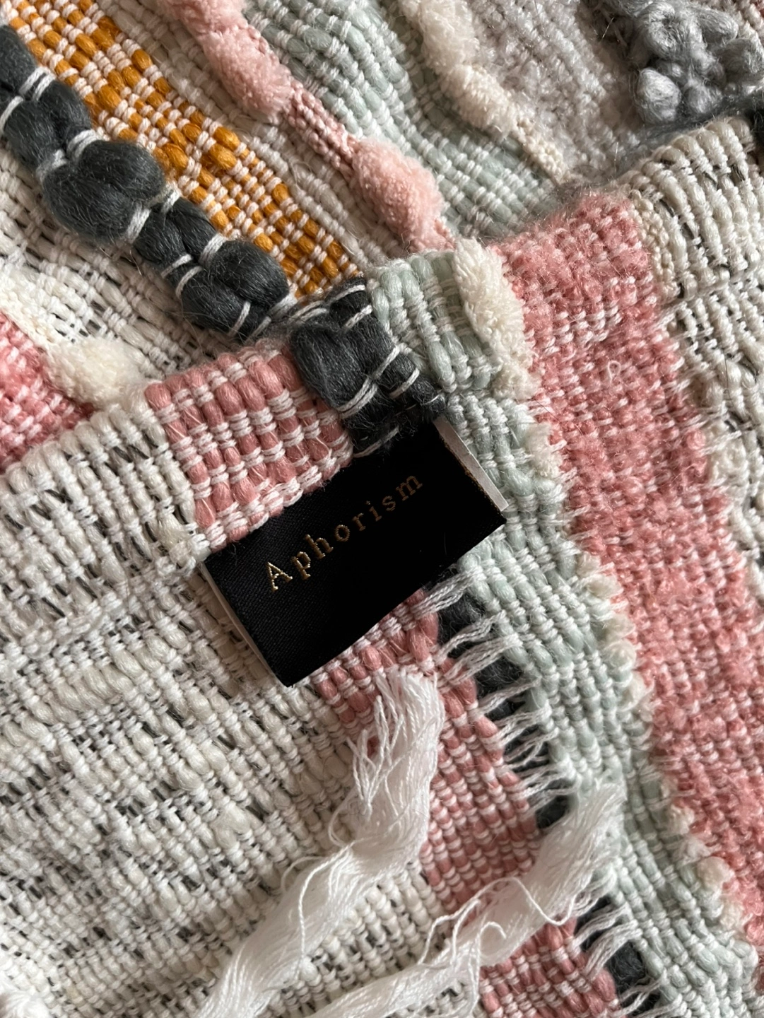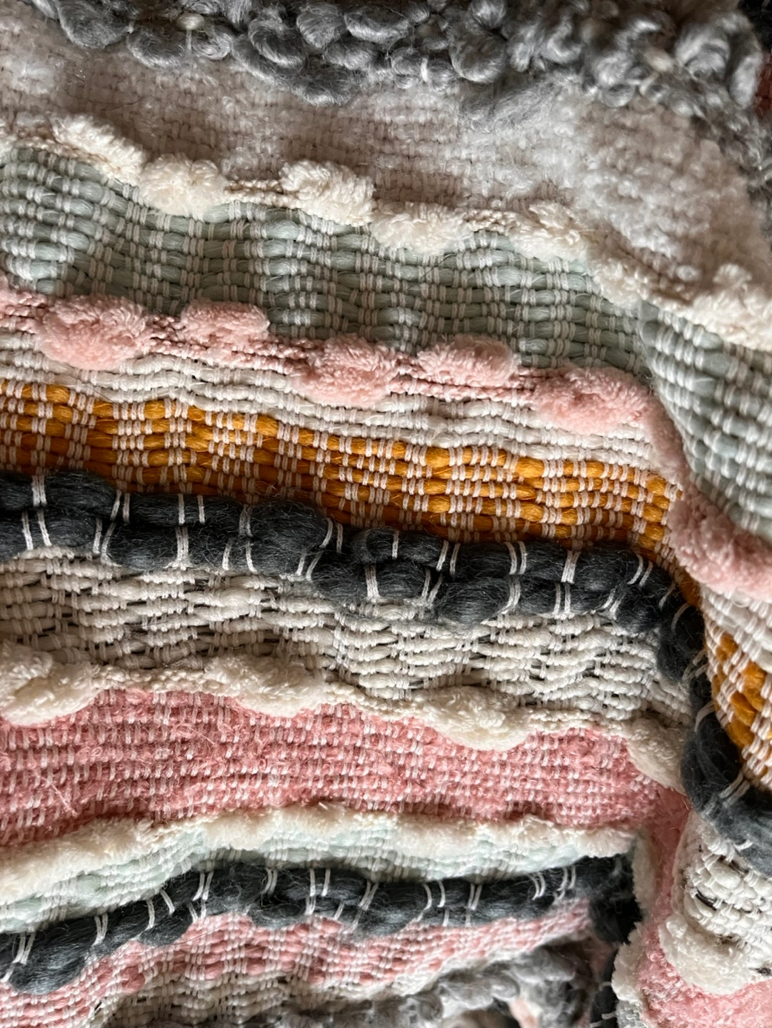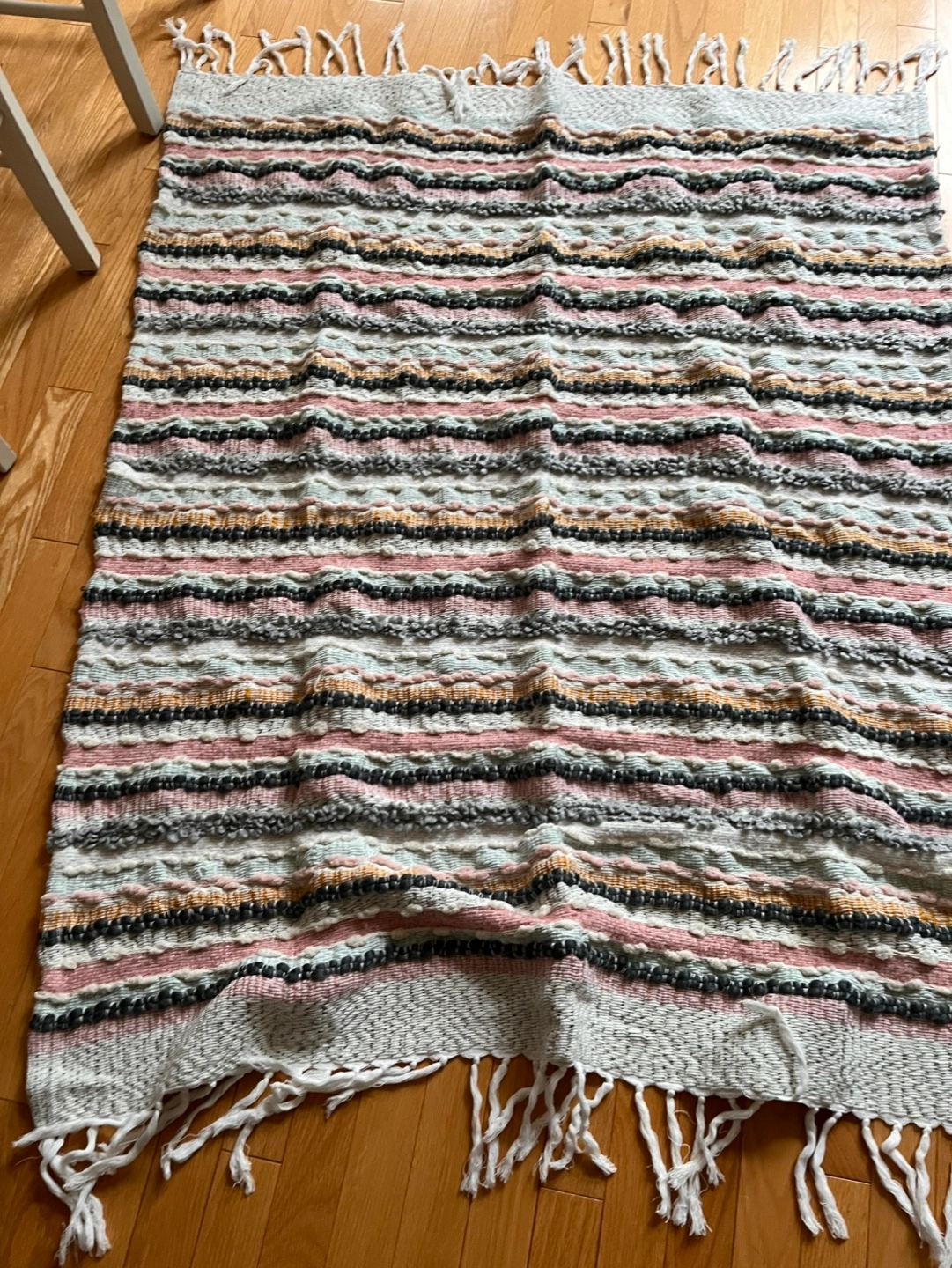 Striped throw blanket. Features a variety of colours including pink, grey, white, and mustard yellow. Fringed edges. Soft and cozy.