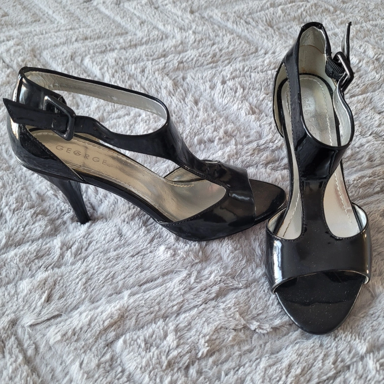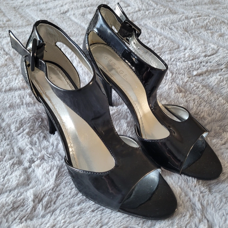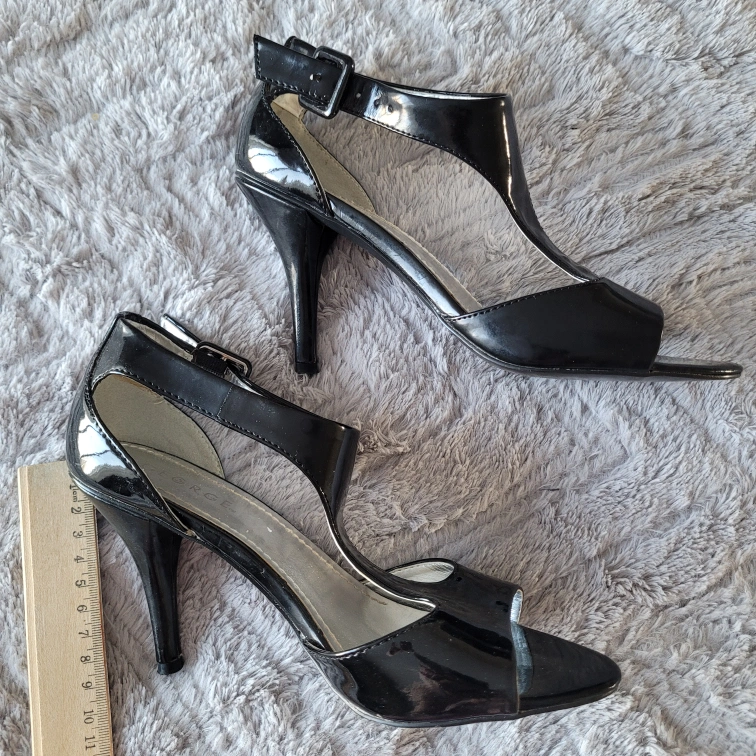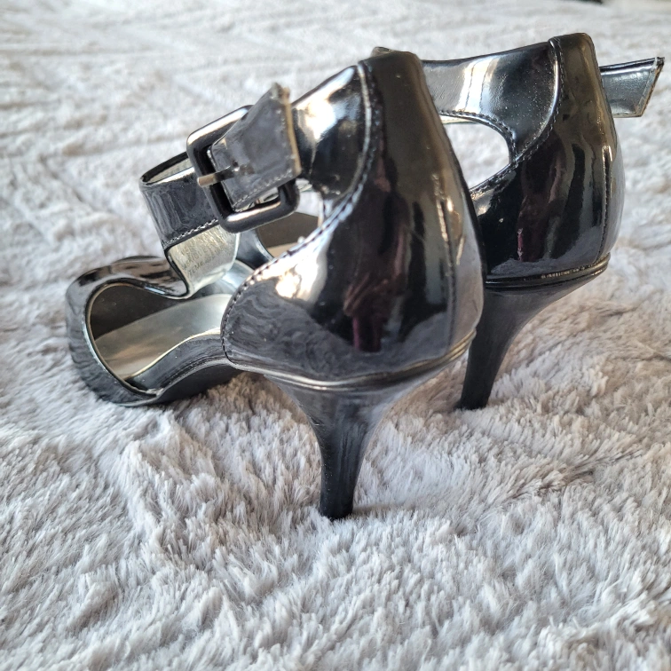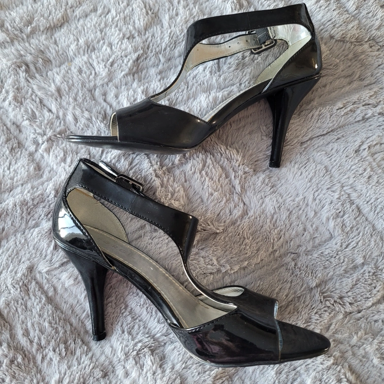 Black heels, in good condition. Ankle strap with buckle closure. Open toe and stiletto-style heel. Size 6