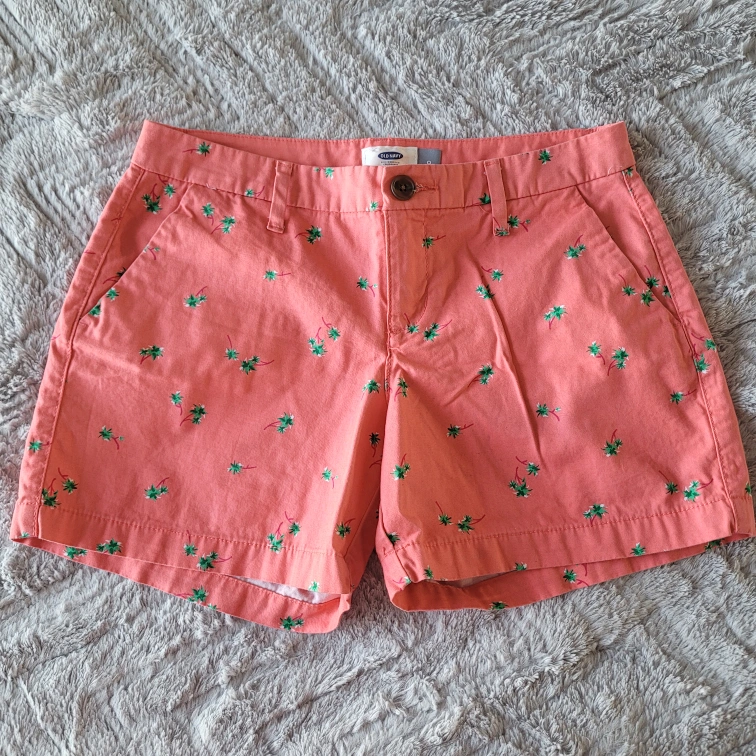 Women's Old Navy shorts. Like new condition. Coral colour with green palm tree print. Size 0. Two front pockets. Button and zipper closure.