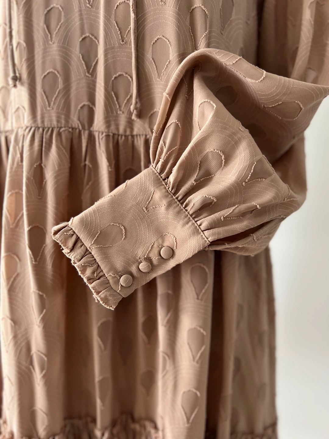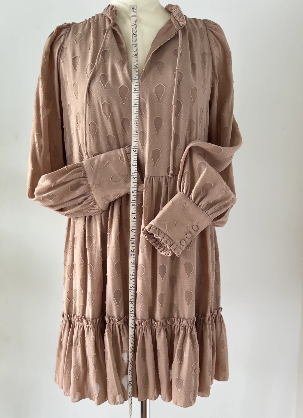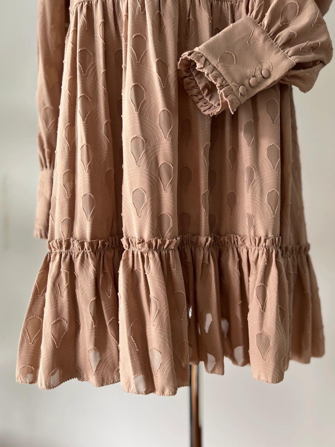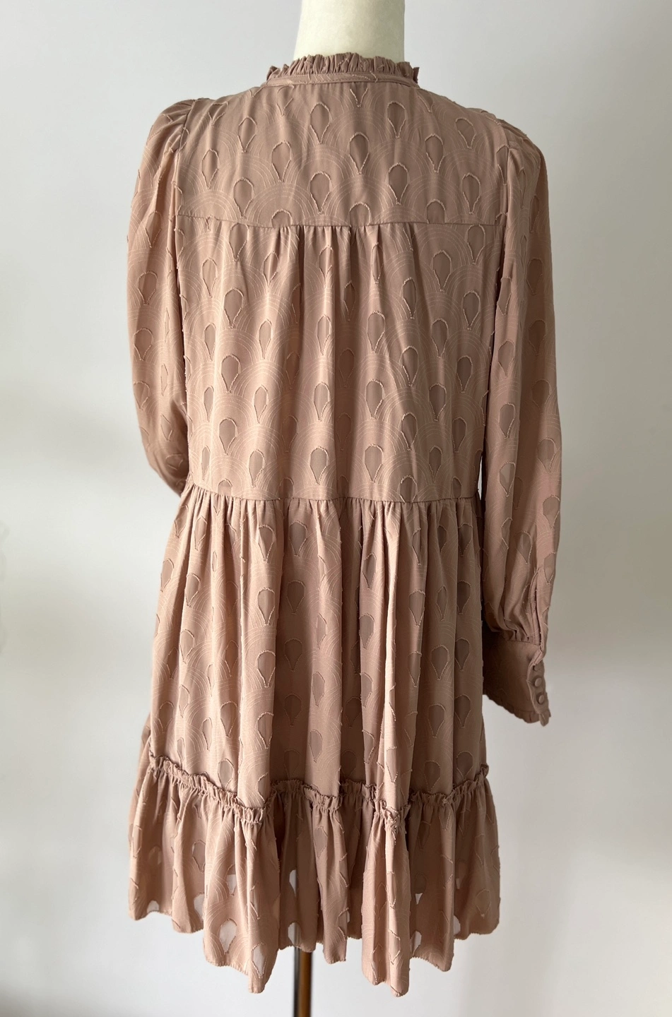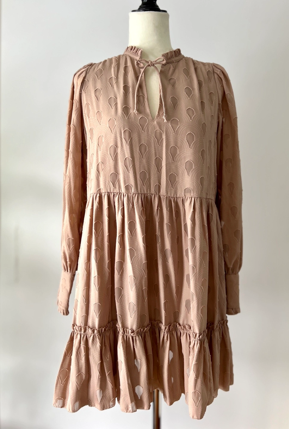 Beautiful blush/beige loose fitting mini baby doll dress. Features a tiered skirt, long sleeves, and keyhole neckline. Cutout pattern throughout. Lightweight material. Perfect for spring or summer. Excellent condition. Extra button attached inside.