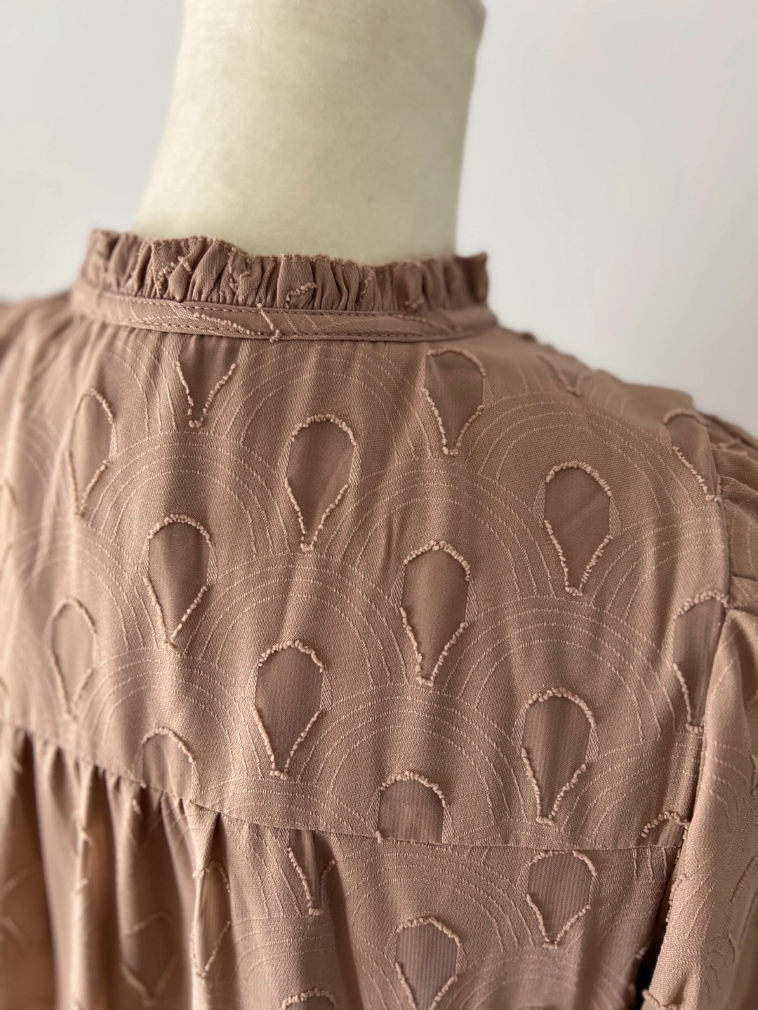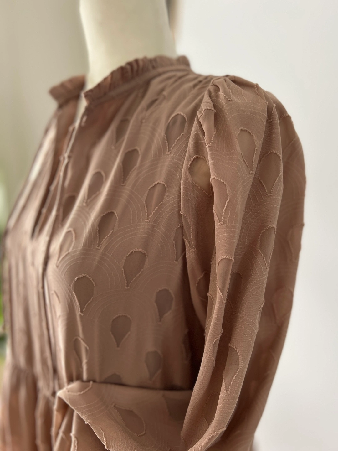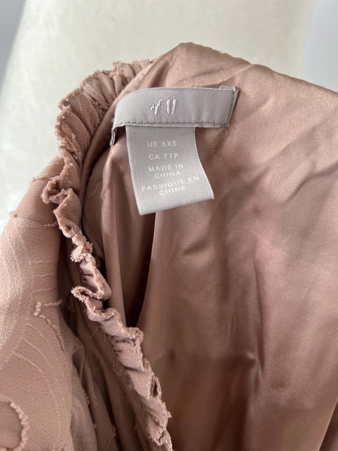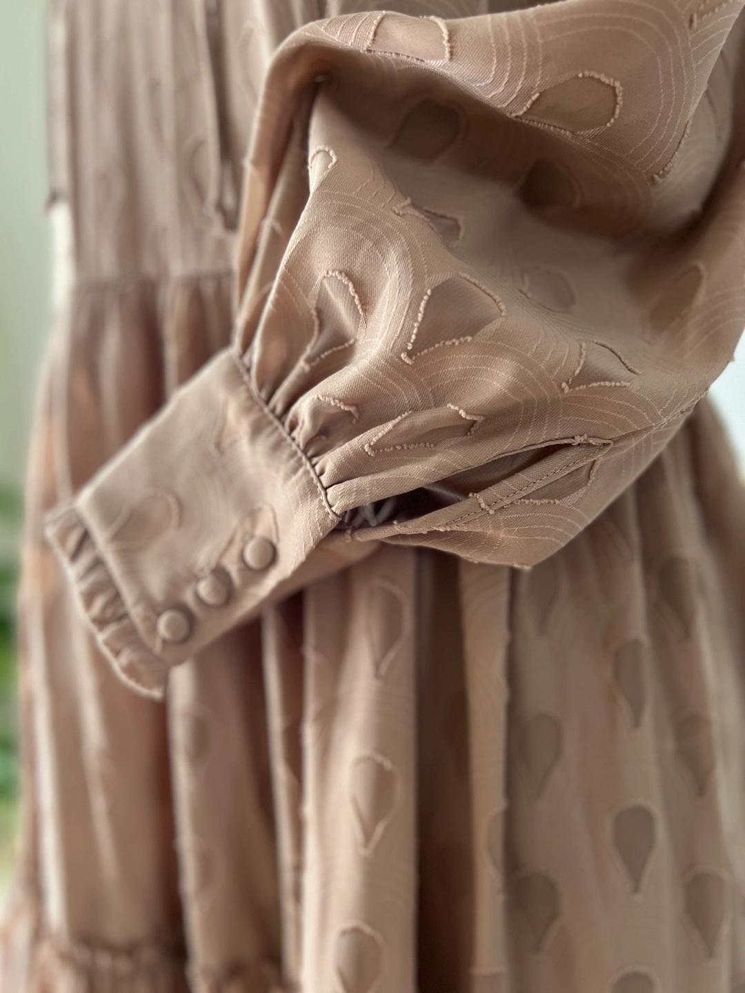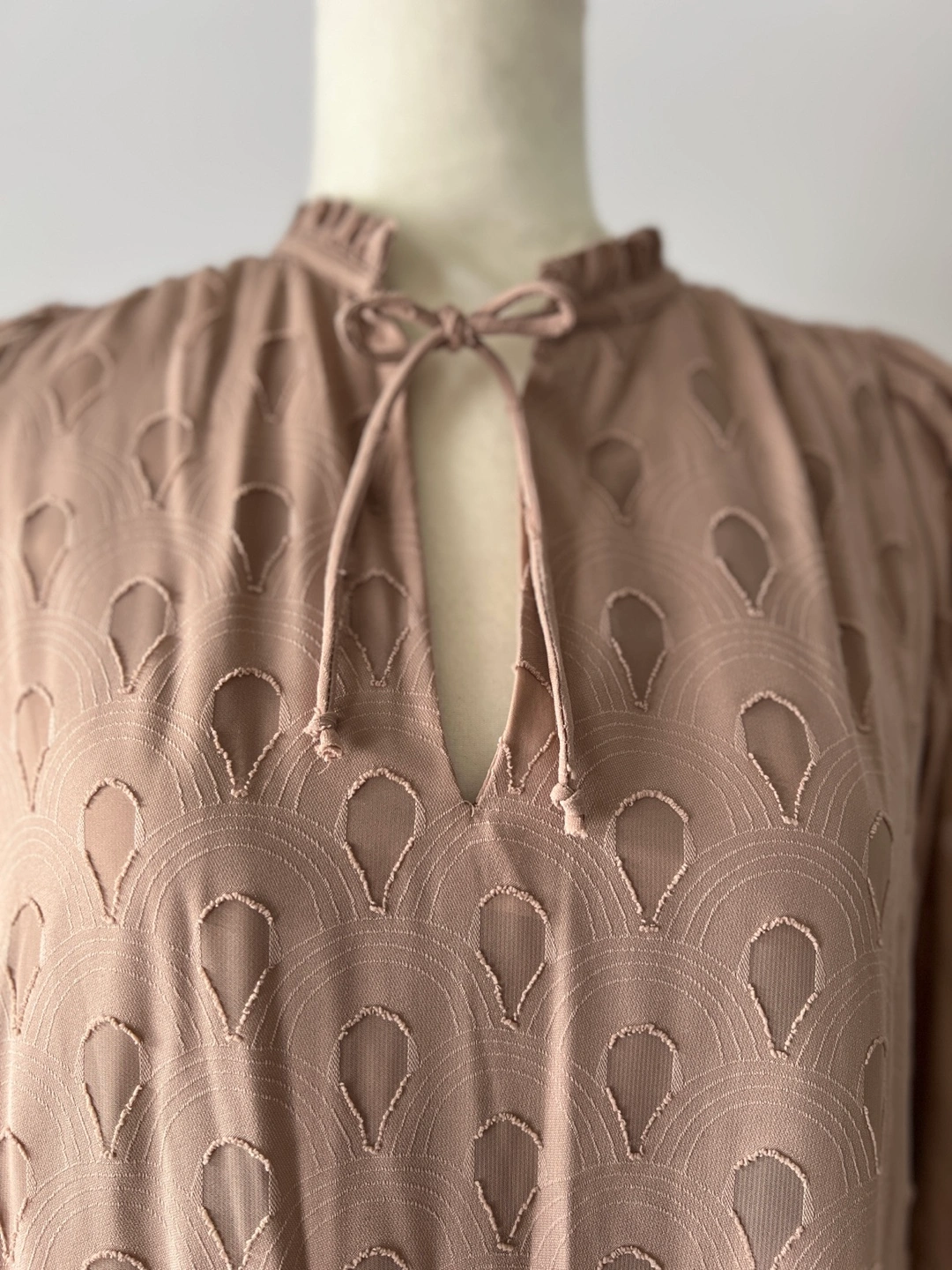 Beautiful blush/beige loose fitting mini baby doll dress. Features a tiered skirt, long sleeves, and keyhole neckline. Cutout pattern throughout. Lightweight material. Perfect for spring or summer. Excellent condition. Extra button attached inside.