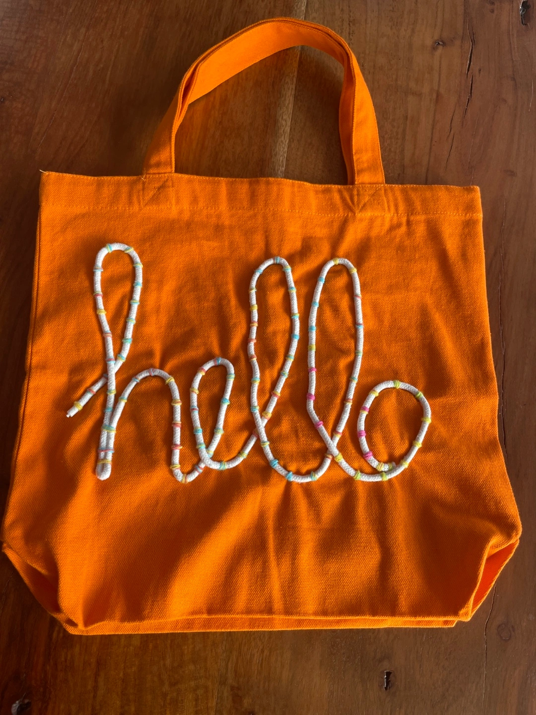 513Orange canvas tote bag. Features embroidered word "Hello" in colourful thread. Perfect for everyday use.