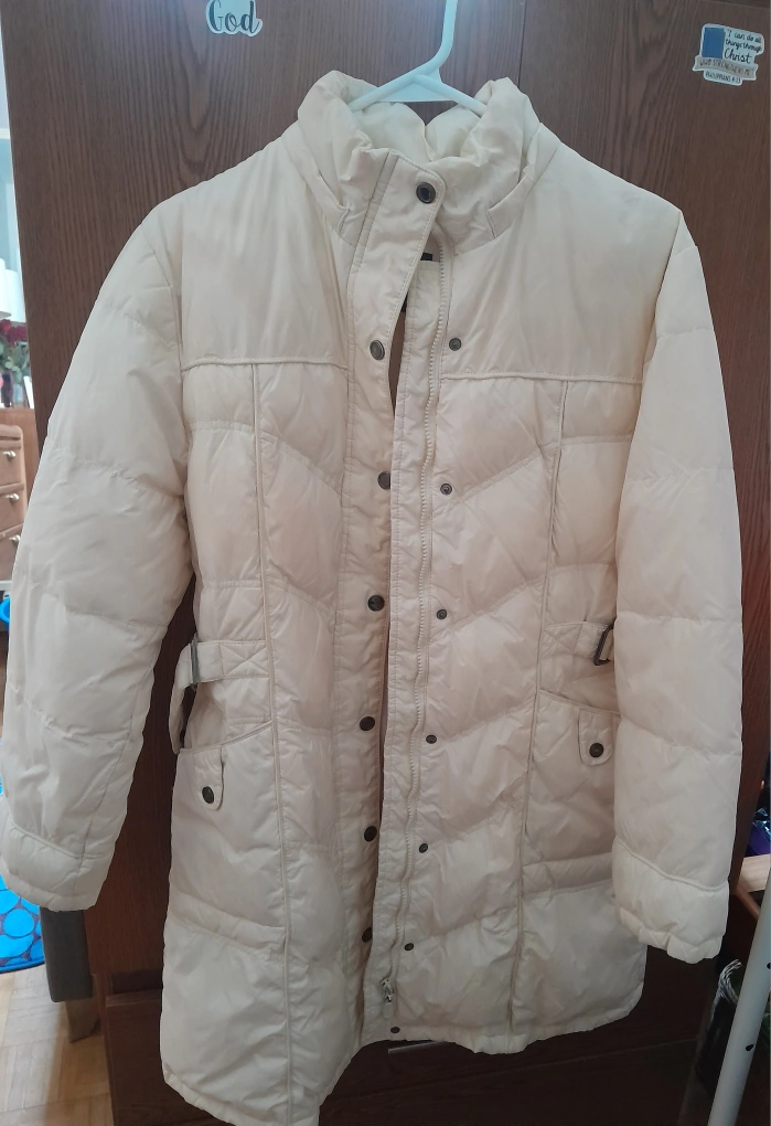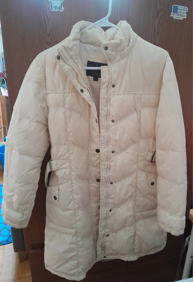 Warm, cream-coloured, long puffer coat. Its good for a medium body size. (Asian size) Features a zipper and snap closure. Belted waist. Some stains near the collar. If someone can still use that would be great.