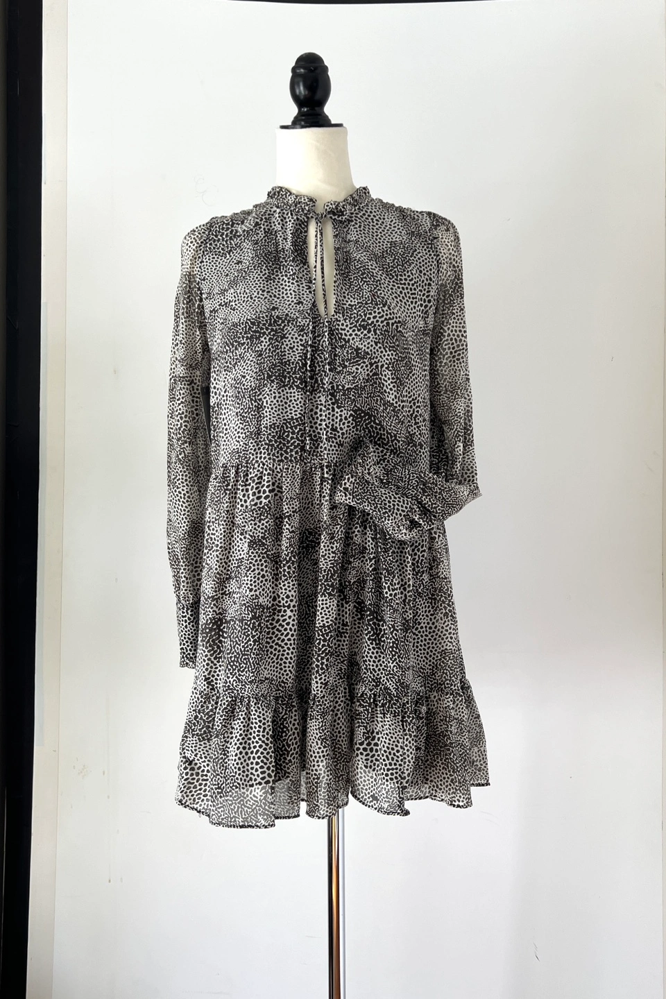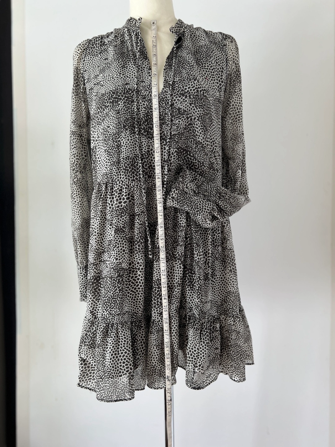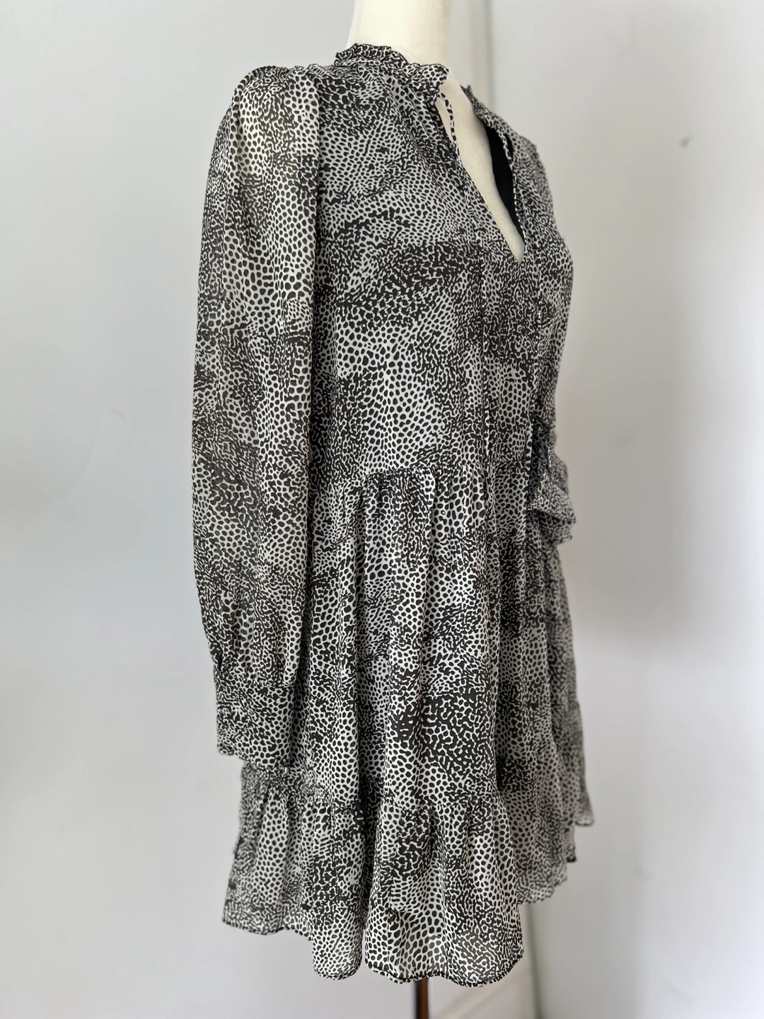 Gorgeous Never Worn. NWT. Tiered mini baby doll dress. Long sleeves with ruffle button cuffs. V-neck with a tie detail. Lightweight fabric. Silky and flowy. Animal print design.