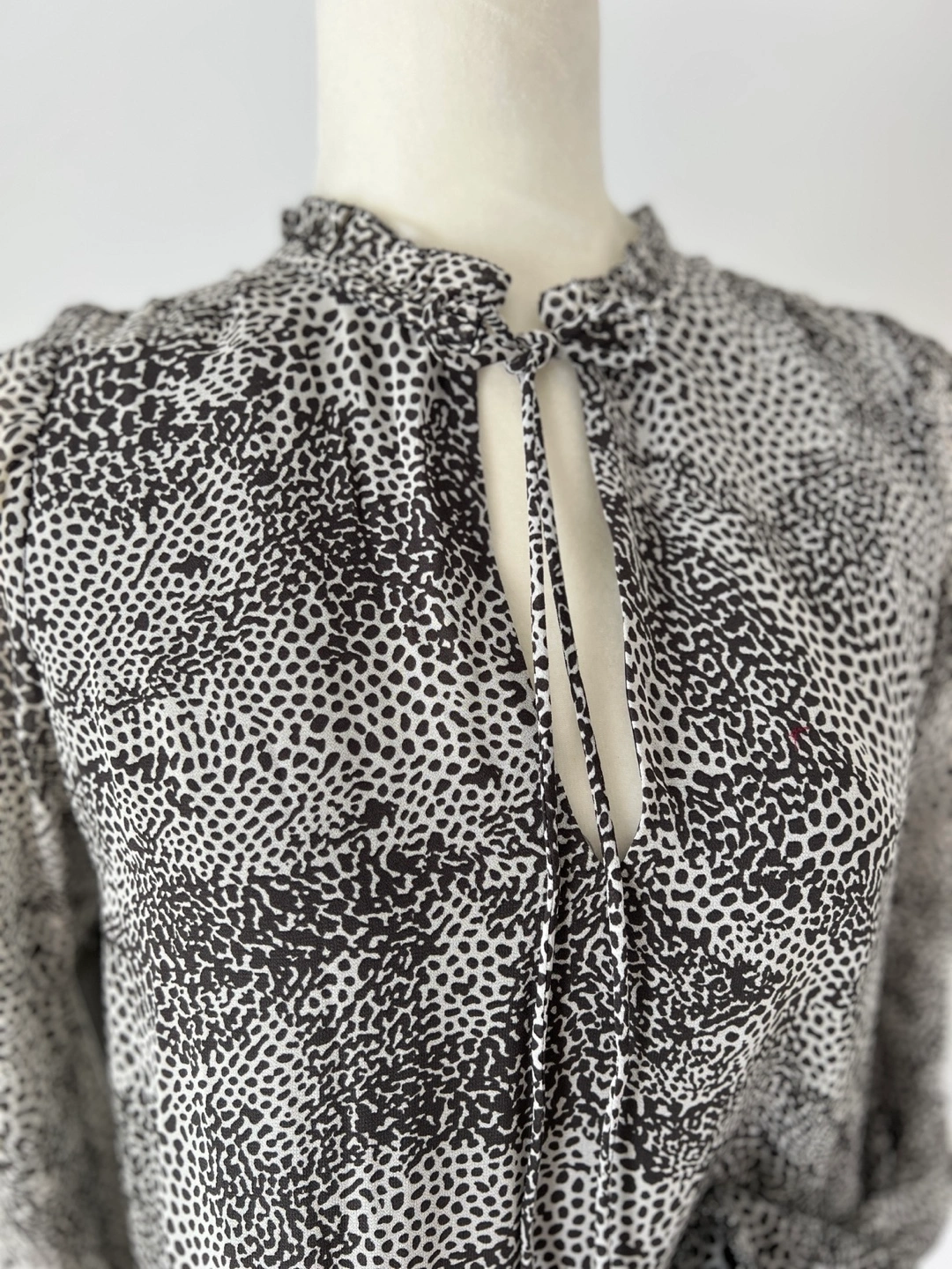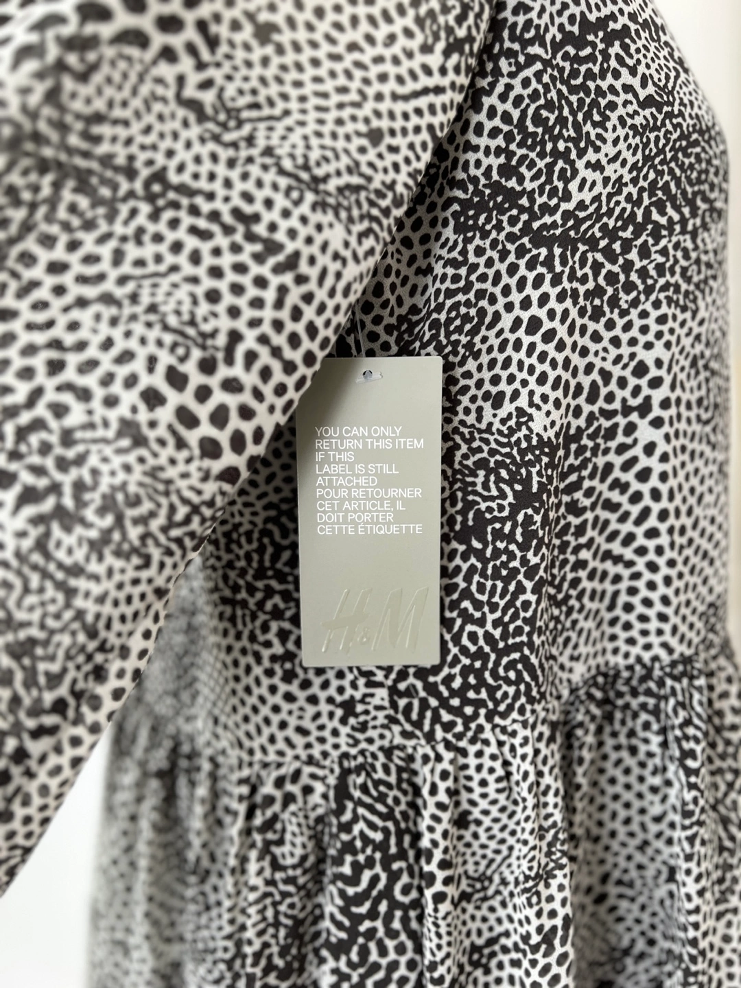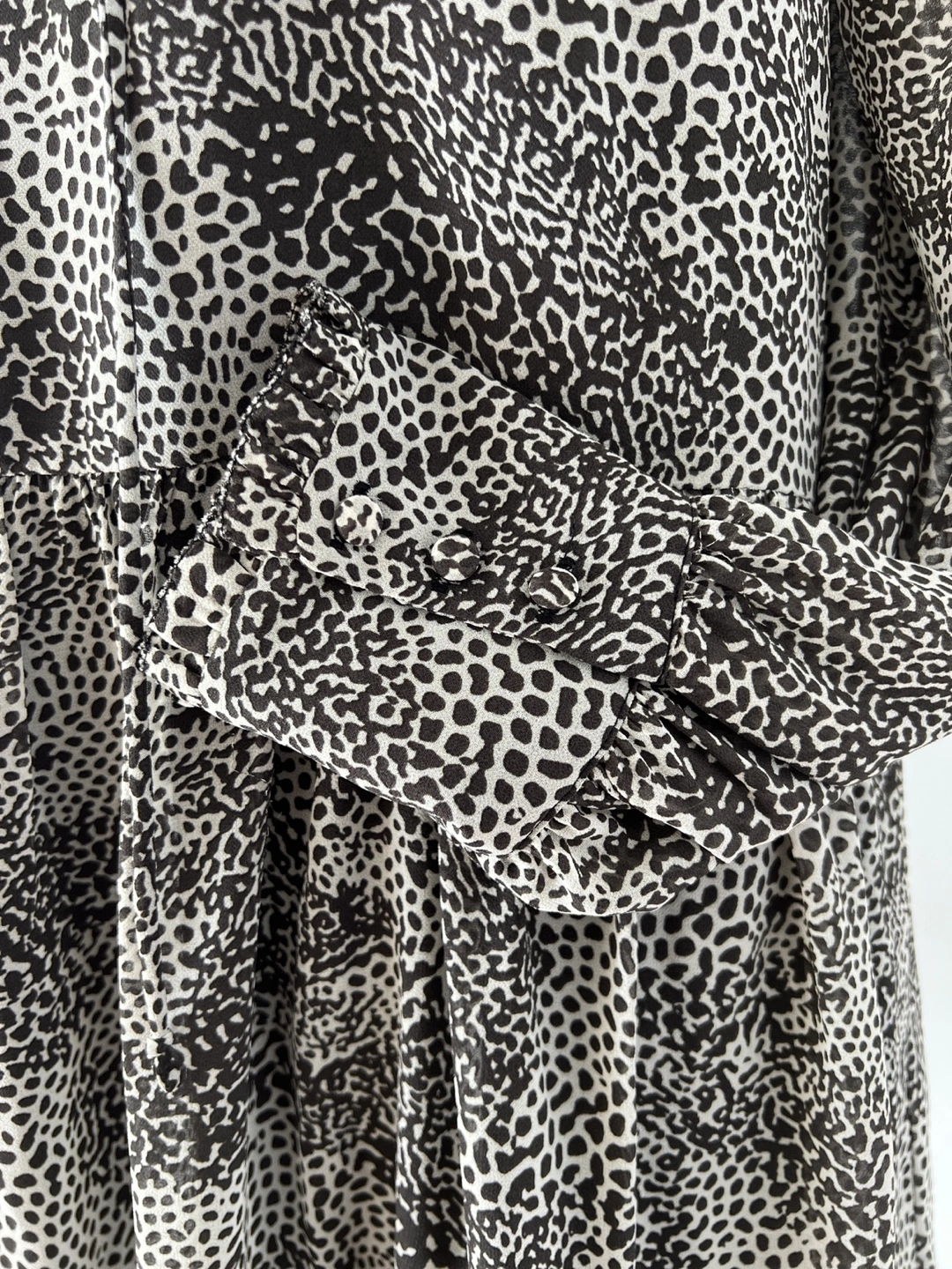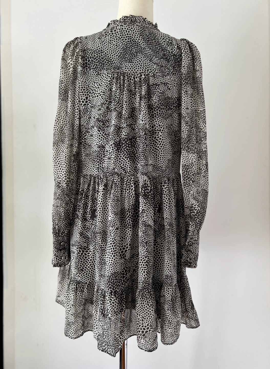 Gorgeous Never Worn. NWT. Tiered mini baby doll dress. Long sleeves with ruffle button cuffs. V-neck with a tie detail. Lightweight fabric. Silky and flowy. Animal print design.