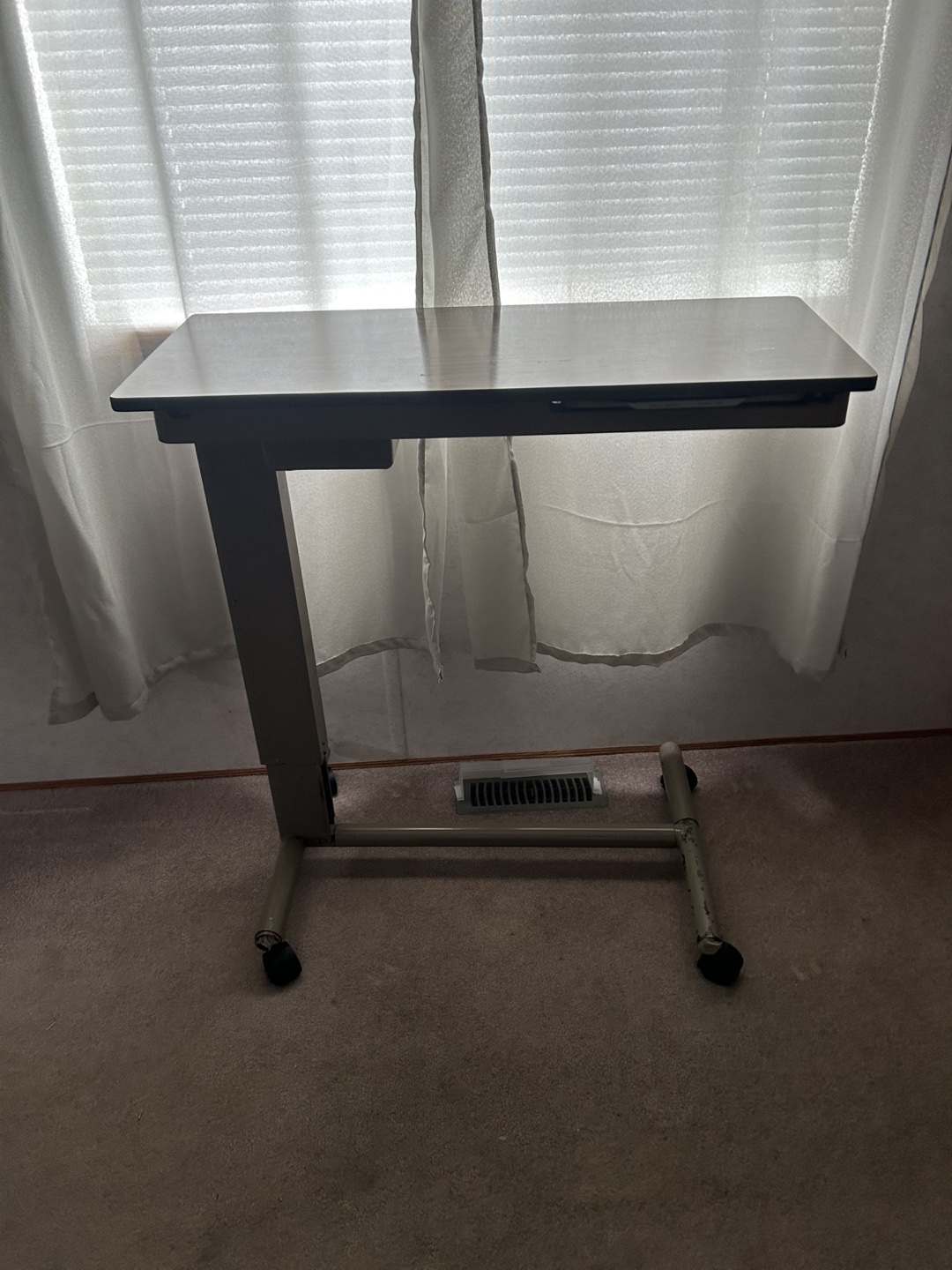 Mobile overbed table. Features a small drawer. Wheels for easy mobility. Light beige colour.