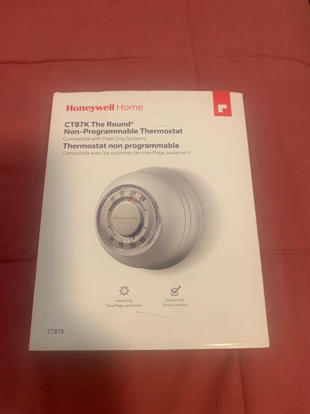New in box. Round non-programmable thermostat. Heating only. Easy to use. Compatible with heating systems only. Includes mounting hardware.