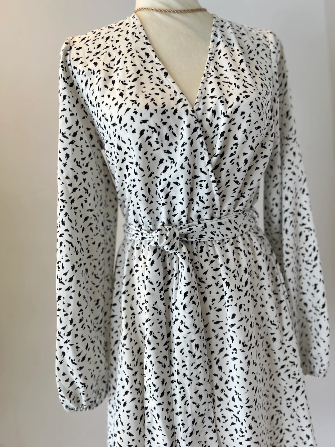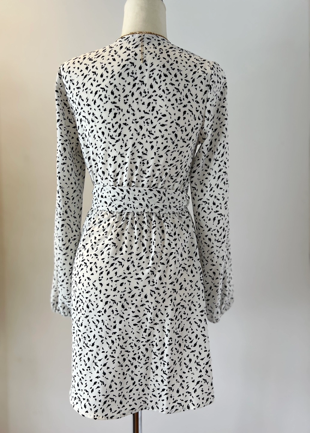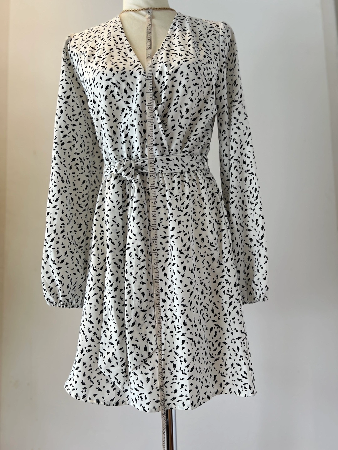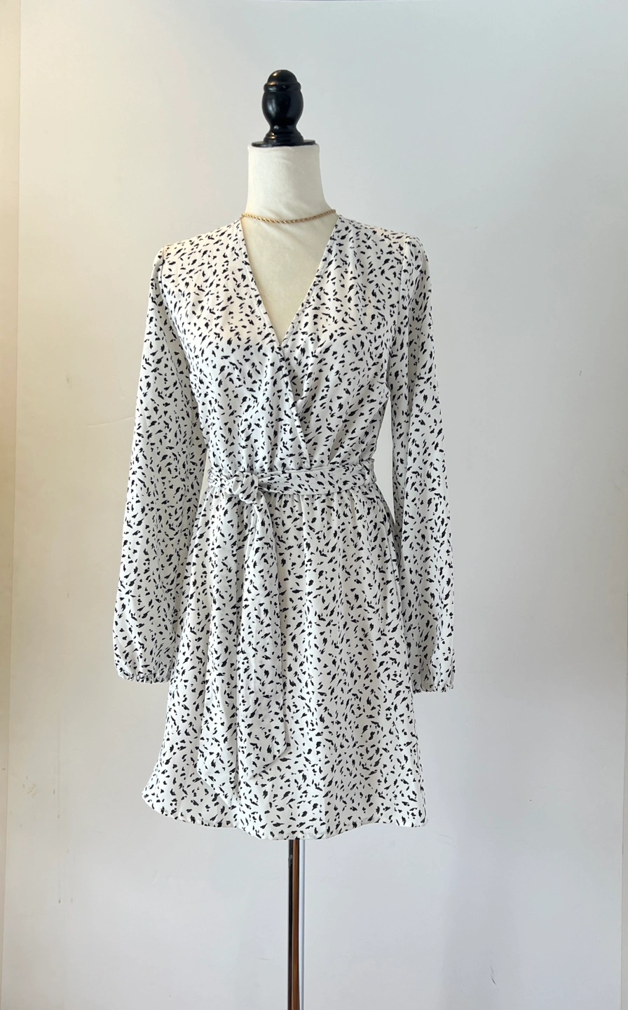 Very pretty wrap-style dress. Features a V-neck, long sleeves, and a wrap silhouette. Dalmatian print, cinched waist with self-tie belt. Lightweight material, perfect for spring or summer. Work or date night. Perfect condition.