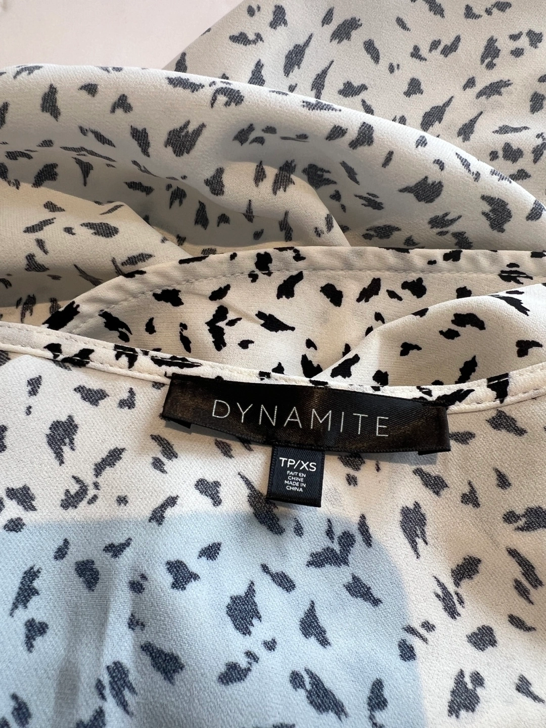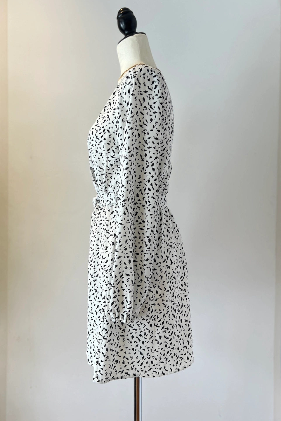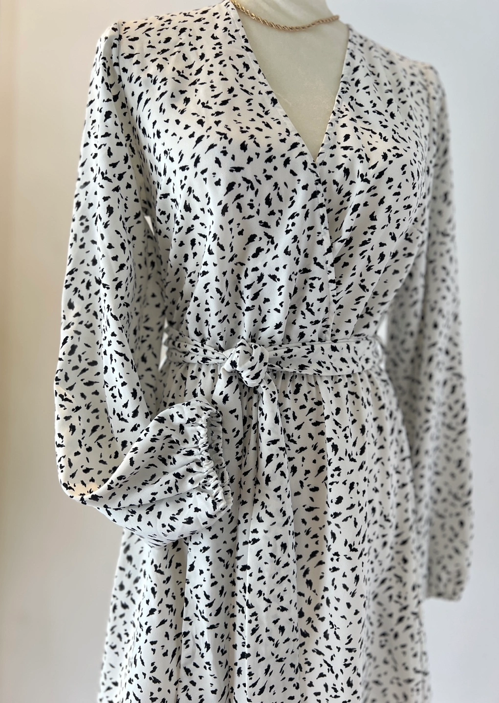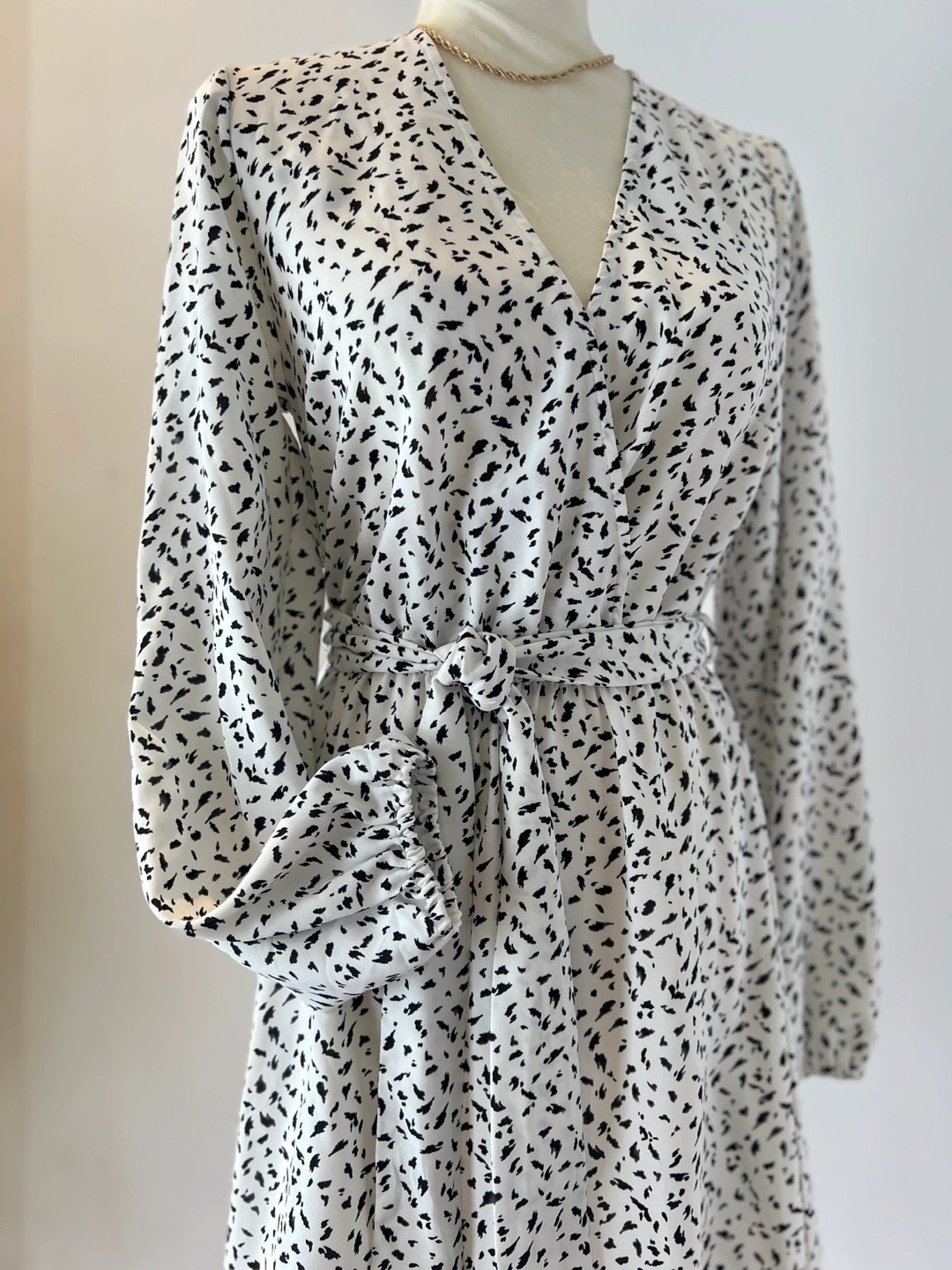 Very pretty wrap-style dress. Features a V-neck, long sleeves, and a wrap silhouette. Dalmatian print, cinched waist with self-tie belt. Lightweight material, perfect for spring or summer. Work or date night. Perfect condition.