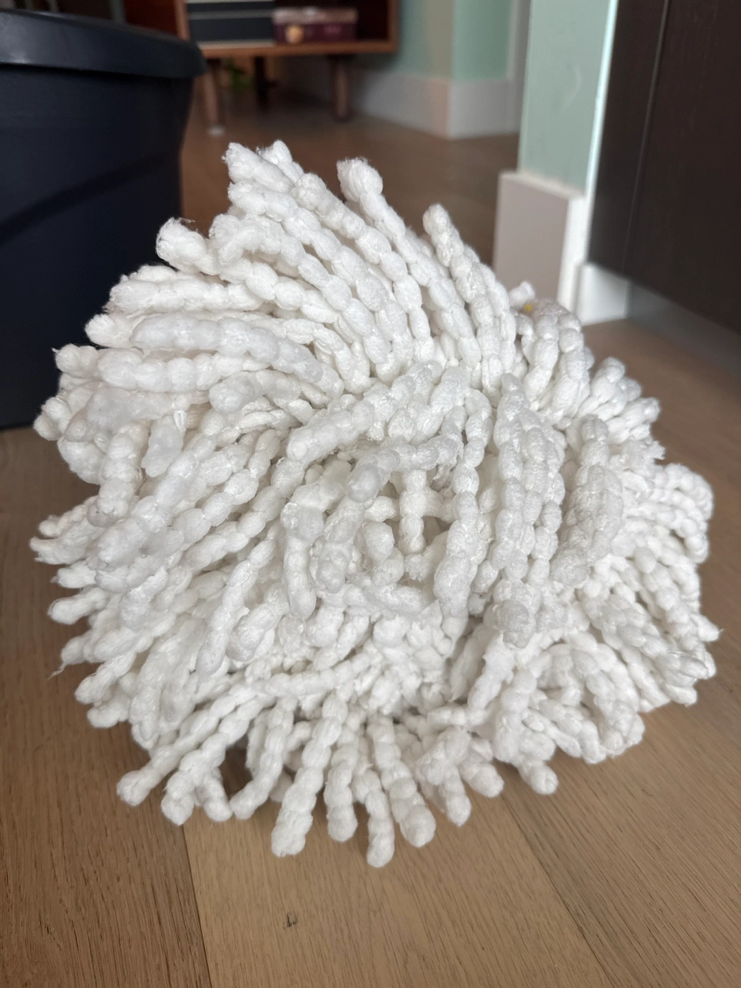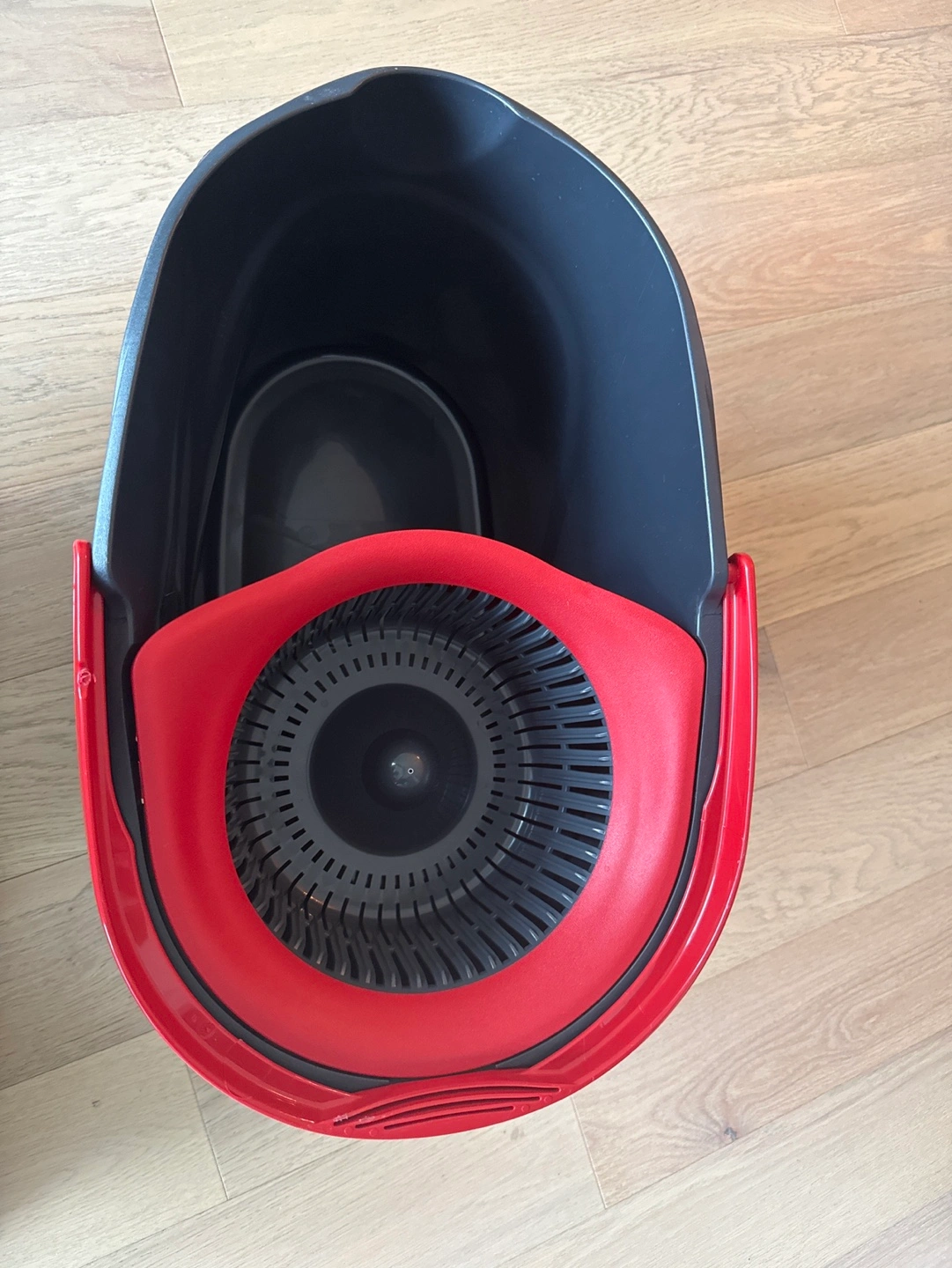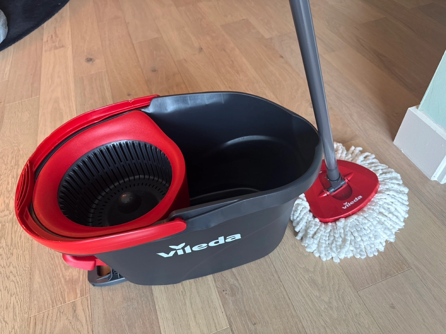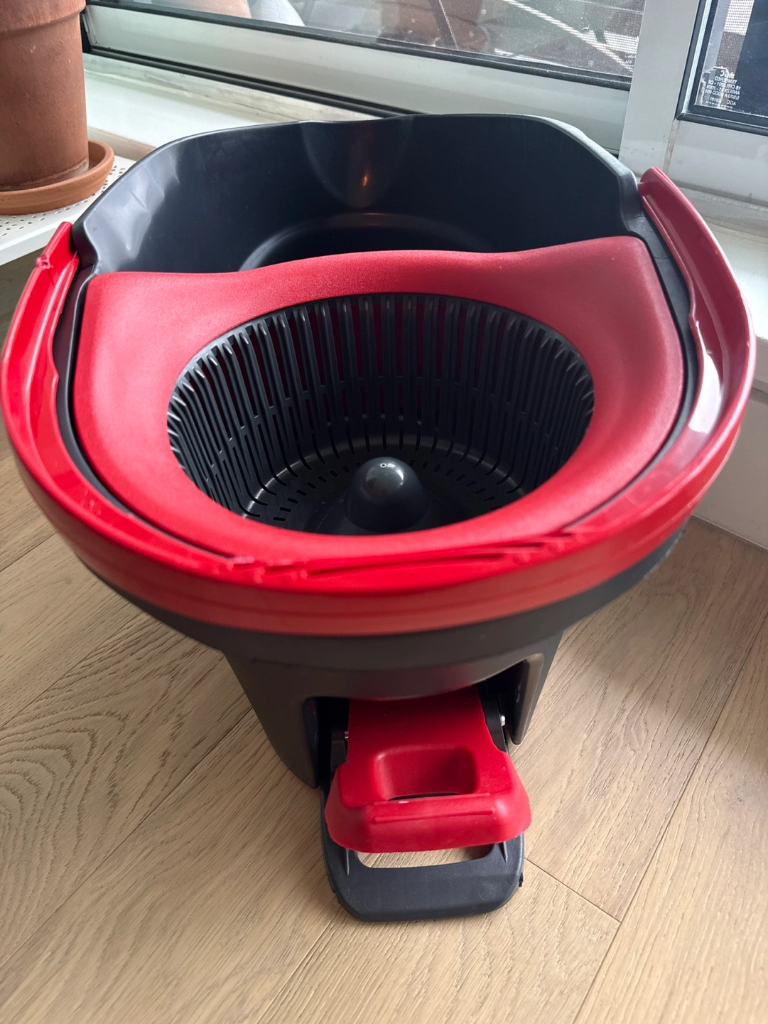 Vileda spin mop and bucket. Grey and red plastic. White microfiber mop head. Easy wringing system. Great for cleaning floors. Used only once, like new.
