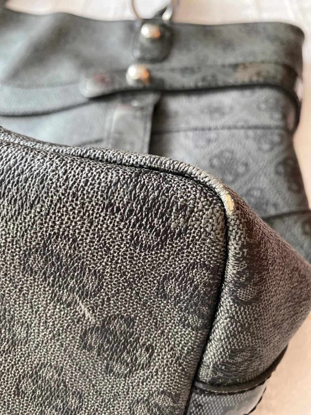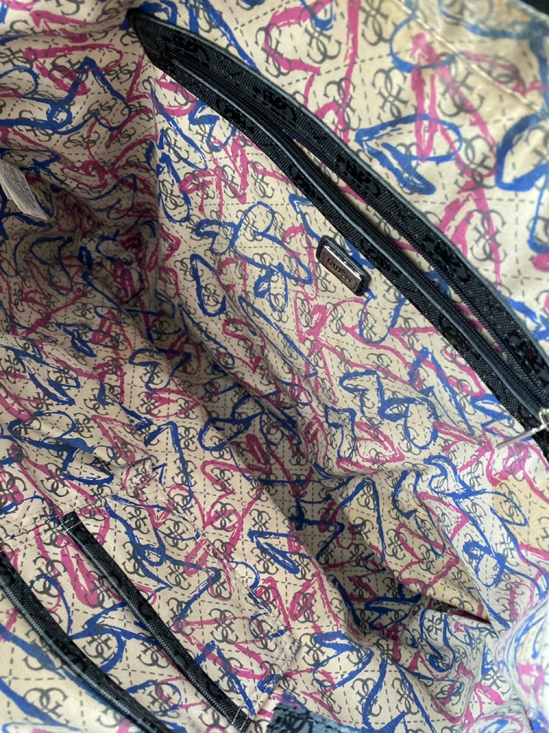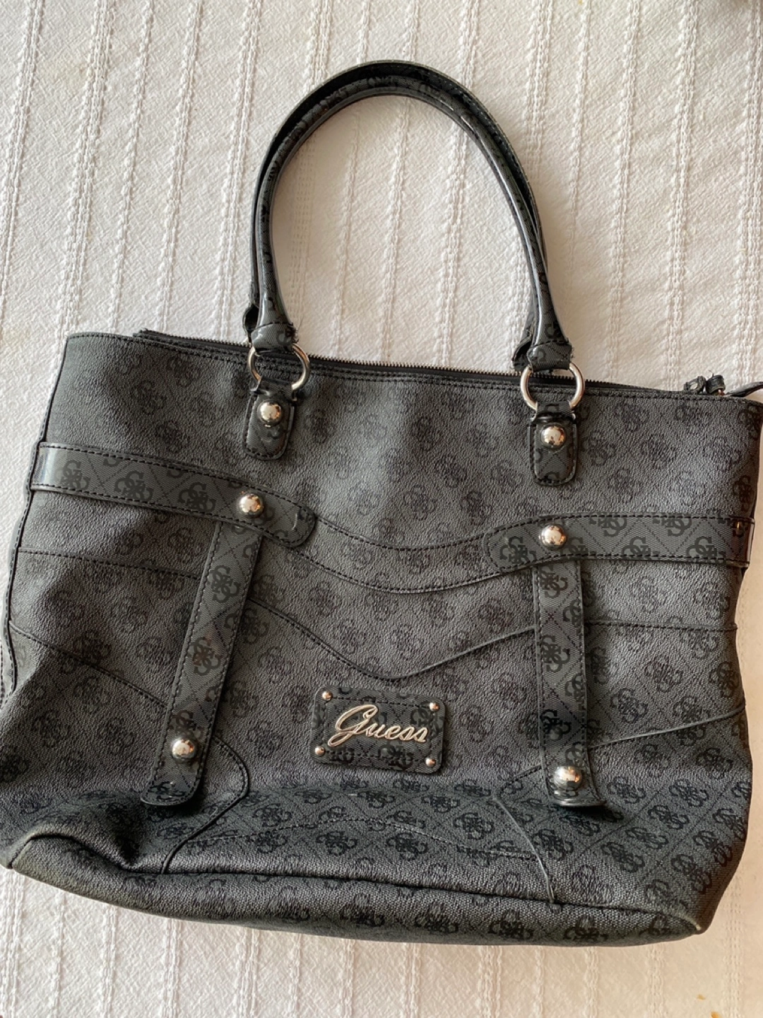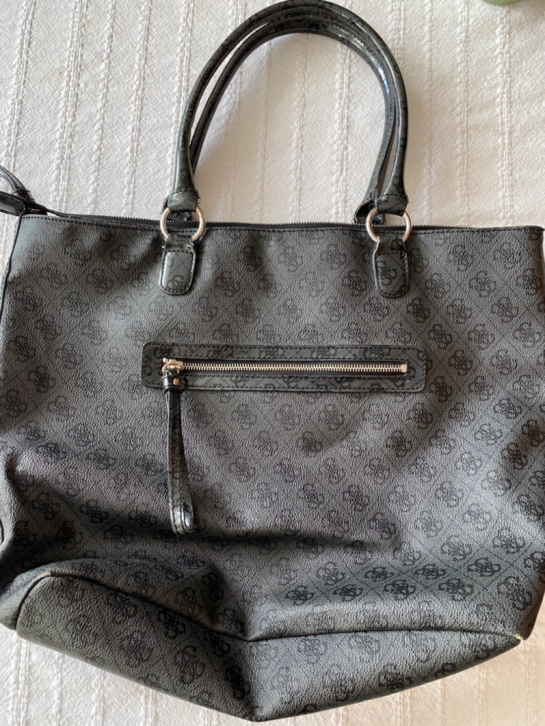 Large black tote bag. Features double vinyl handles, zipper closure, and an interior zip pocket. Guess logo visible throughout. Pre-owned.