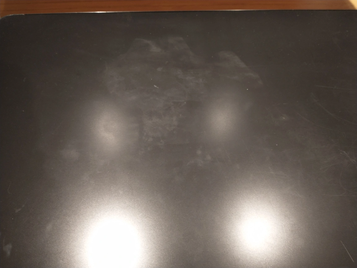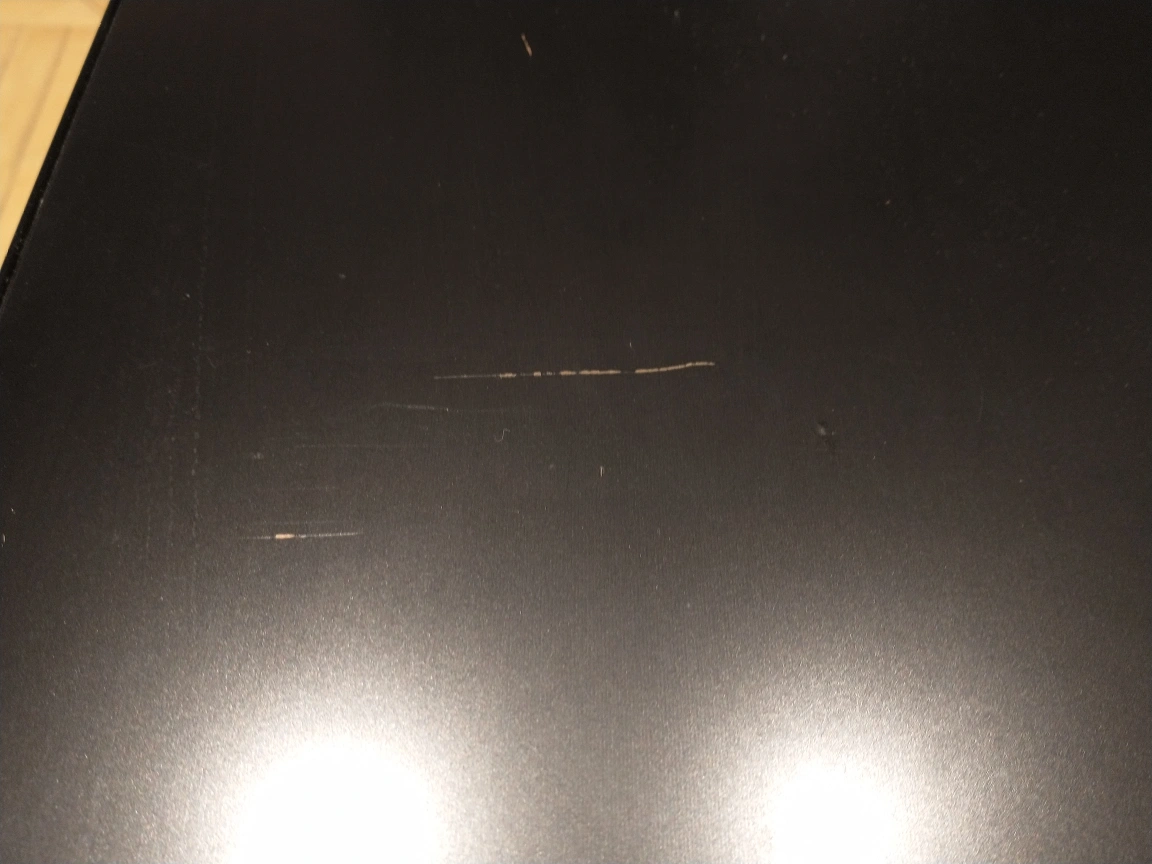 Has a stain and some scratches as pictured, I usually cover it with a table cloth