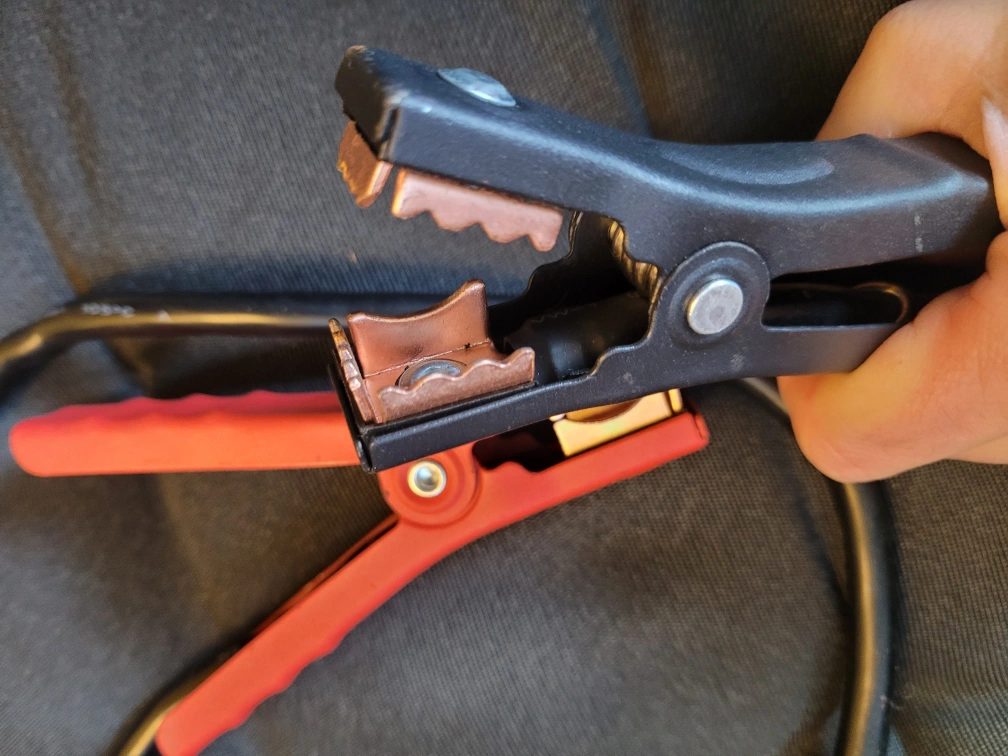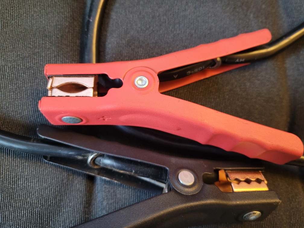 jumper, welding, jump start, grounding cables, replacement clamps. Two clamps, one red and one black. Approximately 80cm long, thick wires, gage 6, 200a stamped rating.