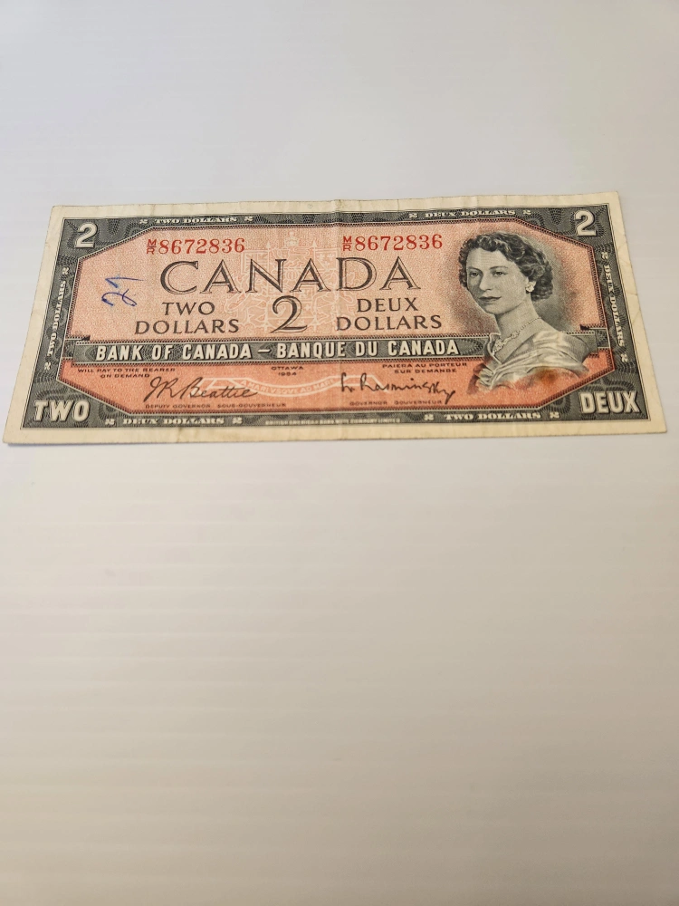 39Rare Canadian two dollar bill. Features a rural landscape on one side and Queen Elizabeth II on the other. Bank of Canada. Serial number visible. Collectible. Good Condition