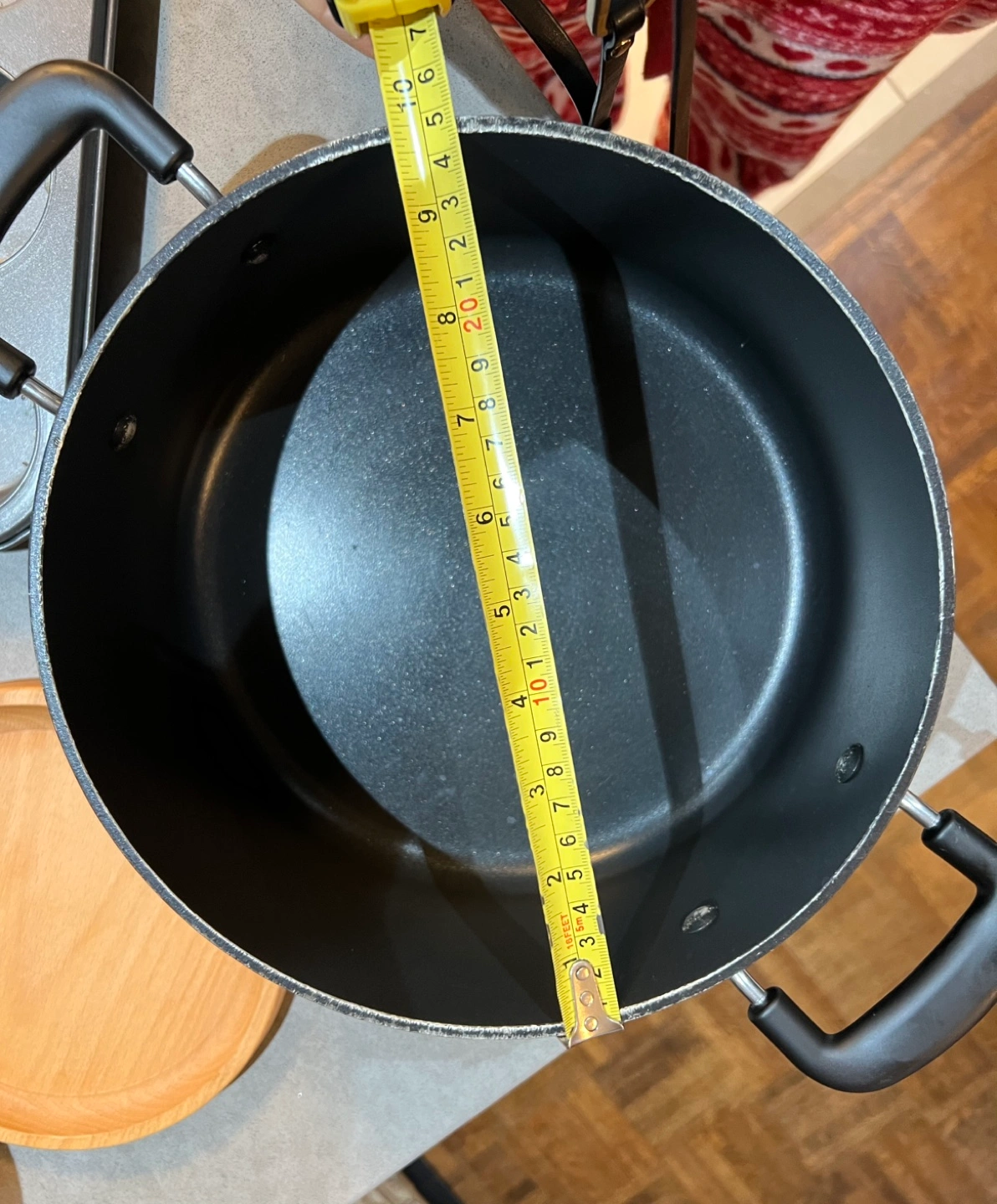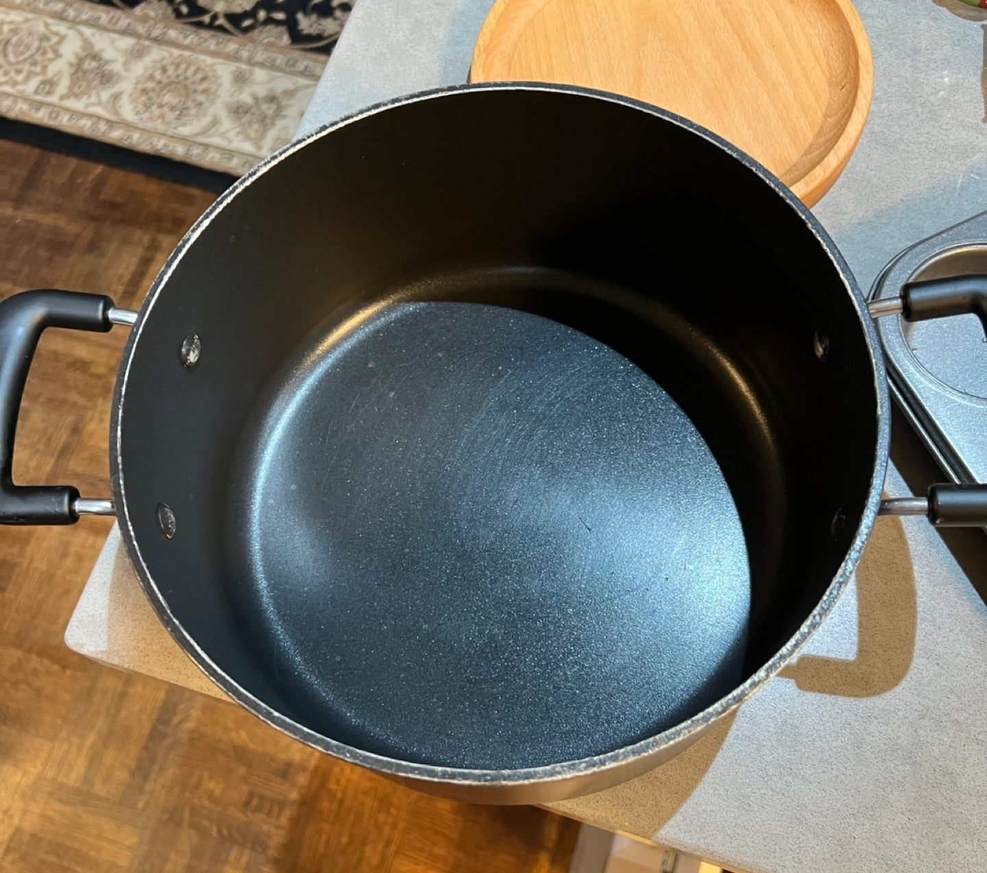 Large Tfal pot. Features two handles. Suitable for stovetop cooking.