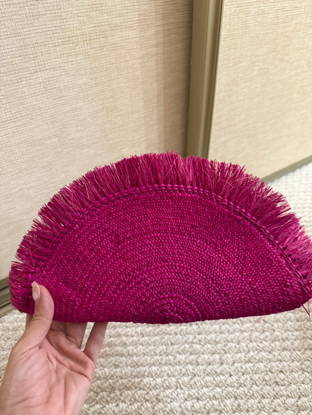 Pink raffia clutch. Half-moon shape. Fringed edges. Zip closure. Interior pocket. Lightweight and perfect for summer. Purchased from Portugal for over $150