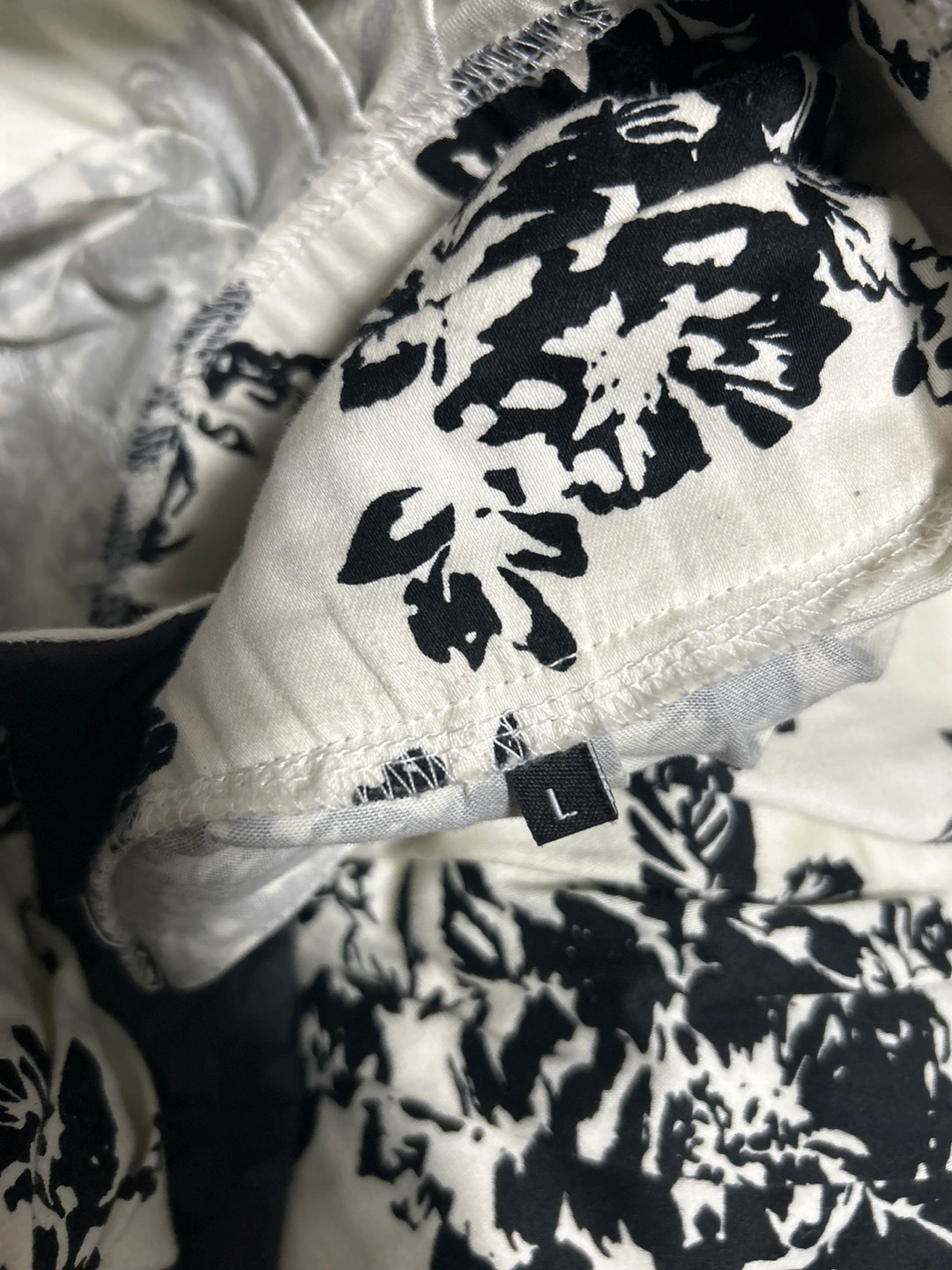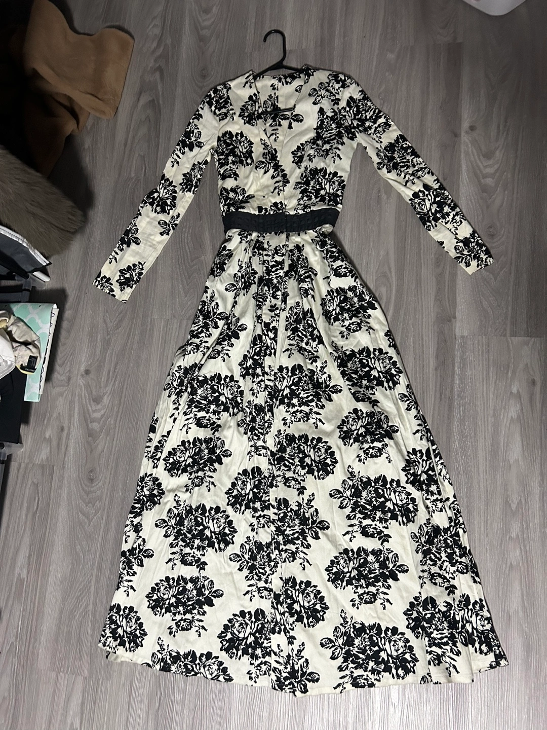 Long-sleeved maxi dress. Features a V-neckline and cinched waist. Black and white floral print. Size large. Had 2 pockets.