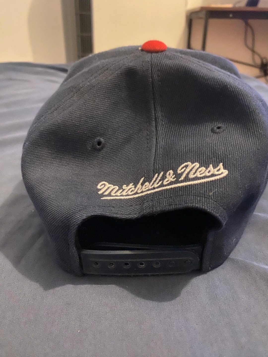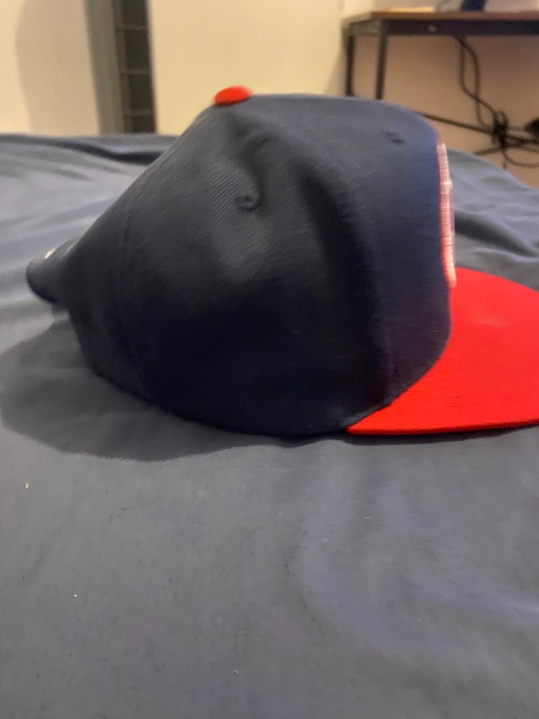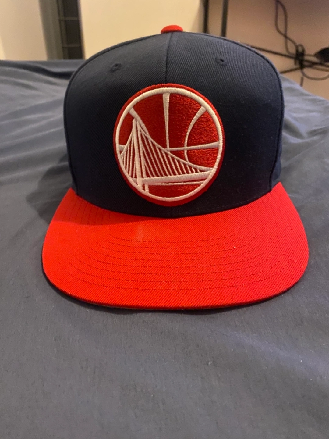 Men's Golden State Warriors snapback hat. Navy blue crown, red brim. Features team logo. Adjustable snapback closure.