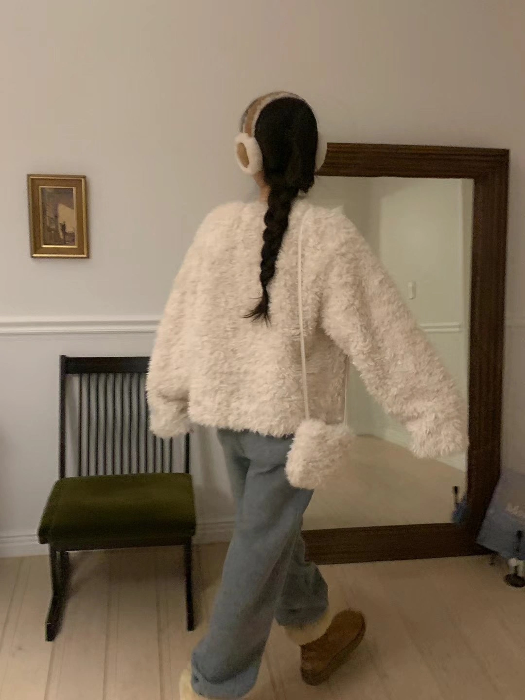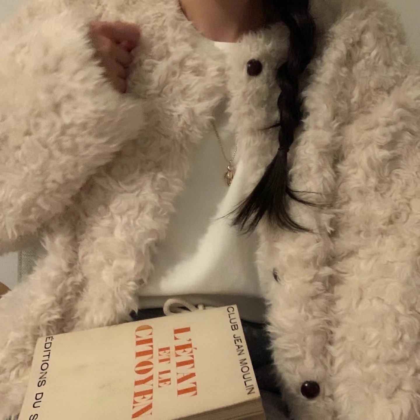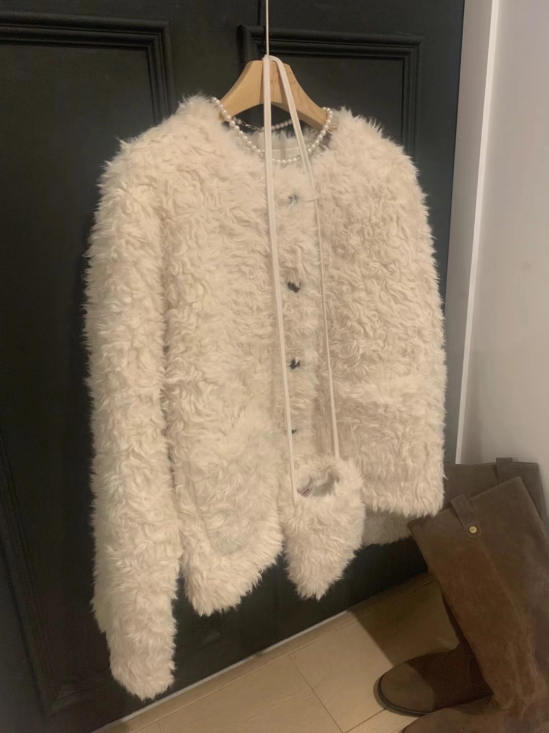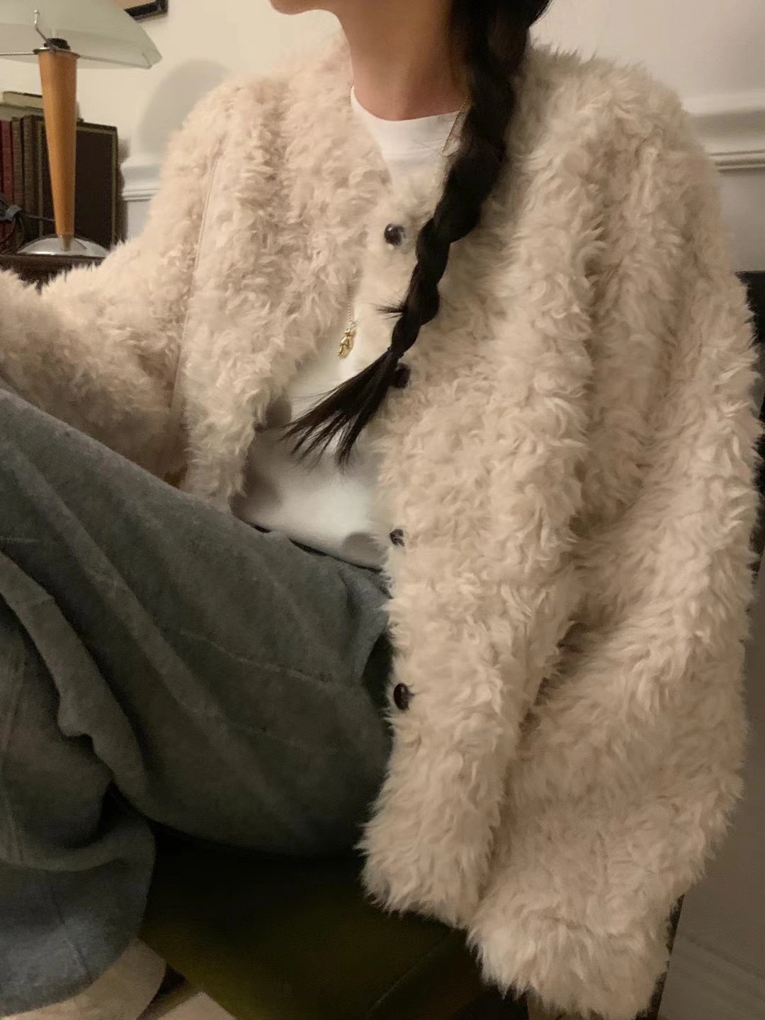 Adorable cream-coloured fluffy cardigan. Button closure. Long sleeves. Oversized fit. Comes with a fuzzy pouch